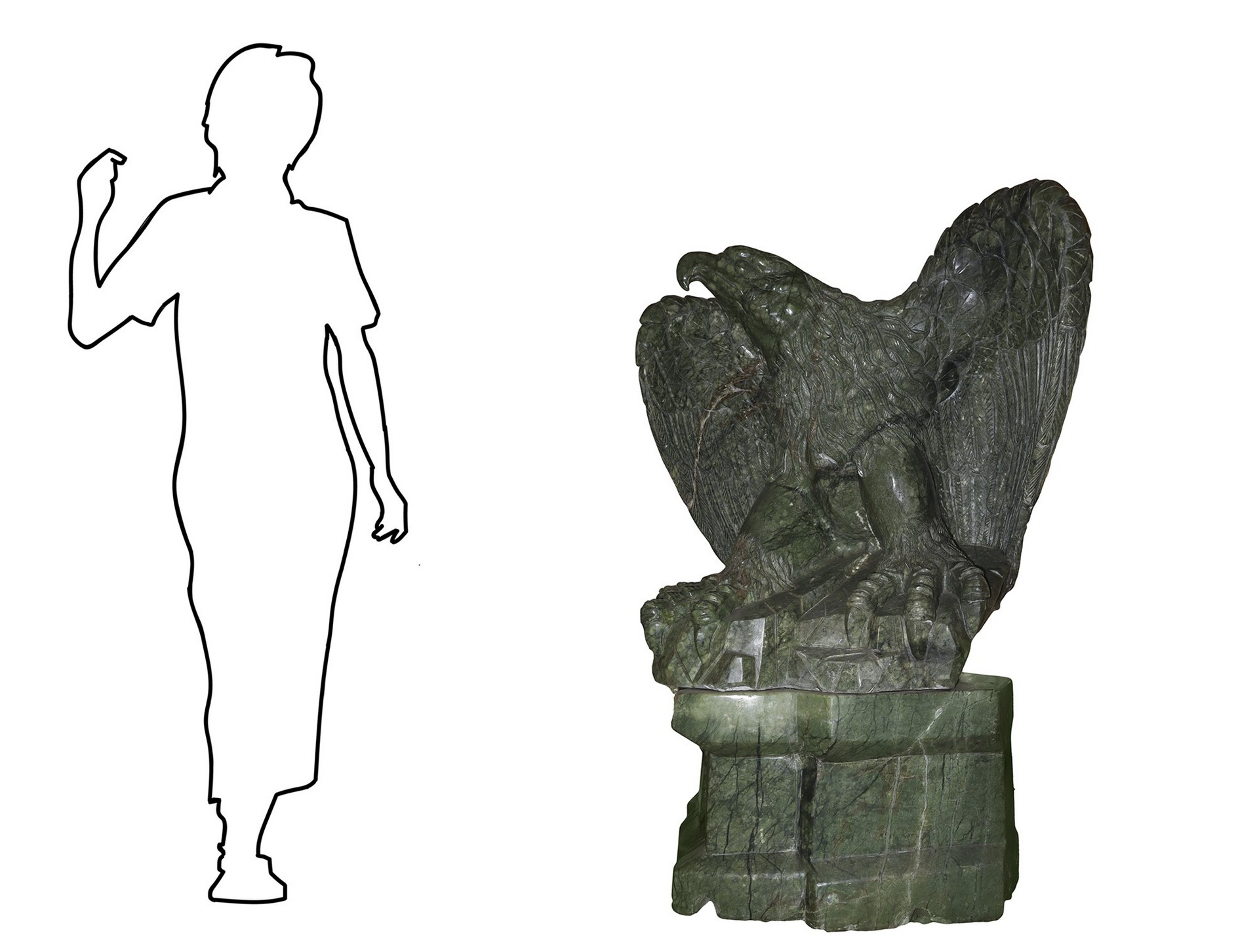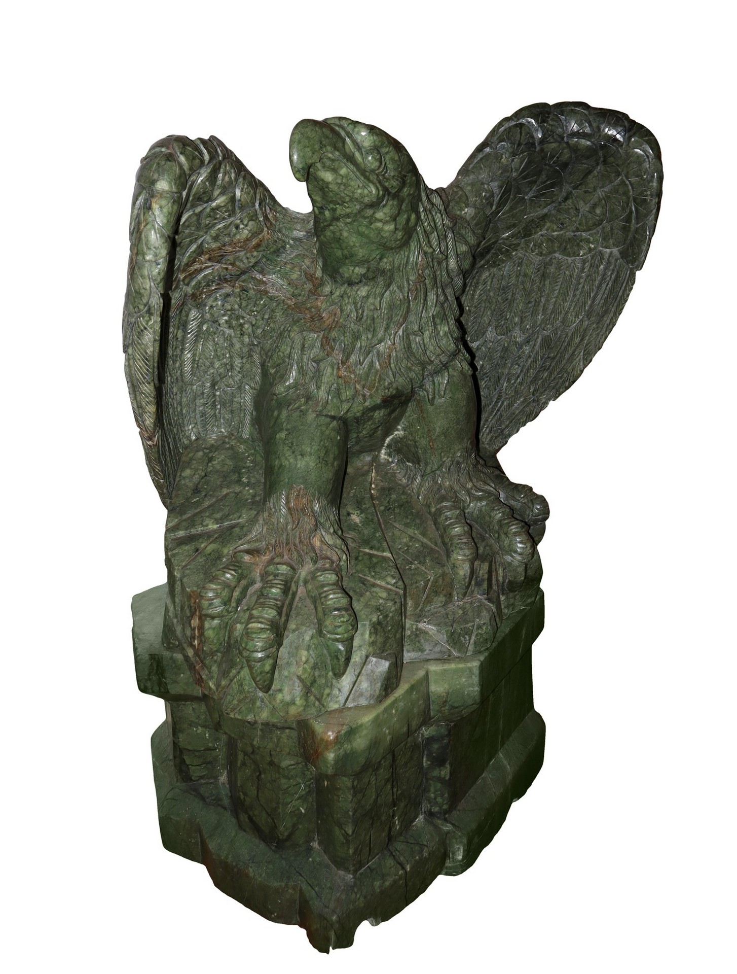 Grande aquila in giada verde, Early 20° secolo h cm 130, apertura ali cm 90; base cm 88 x cm 73 Unico blocco. Presenti venature.Unico blocco. Presenti venature.