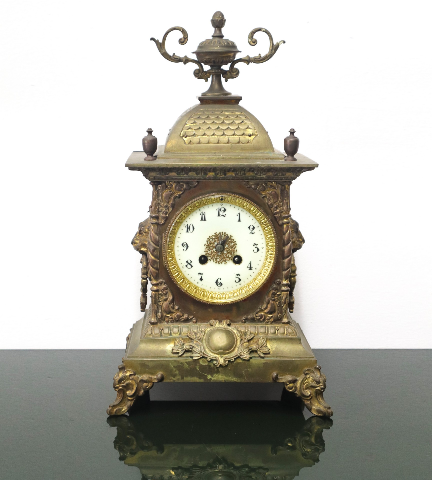 Orologio da tavolo a pendolo. In metallo dorato con quadrante in porcellana , Late 19° secolo