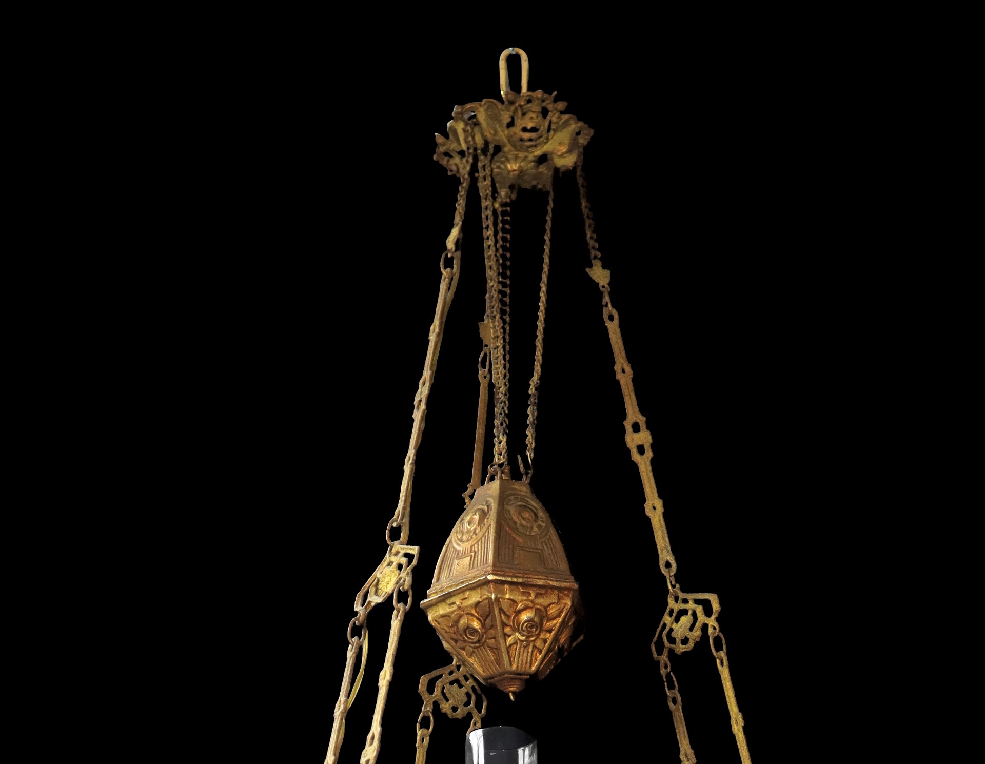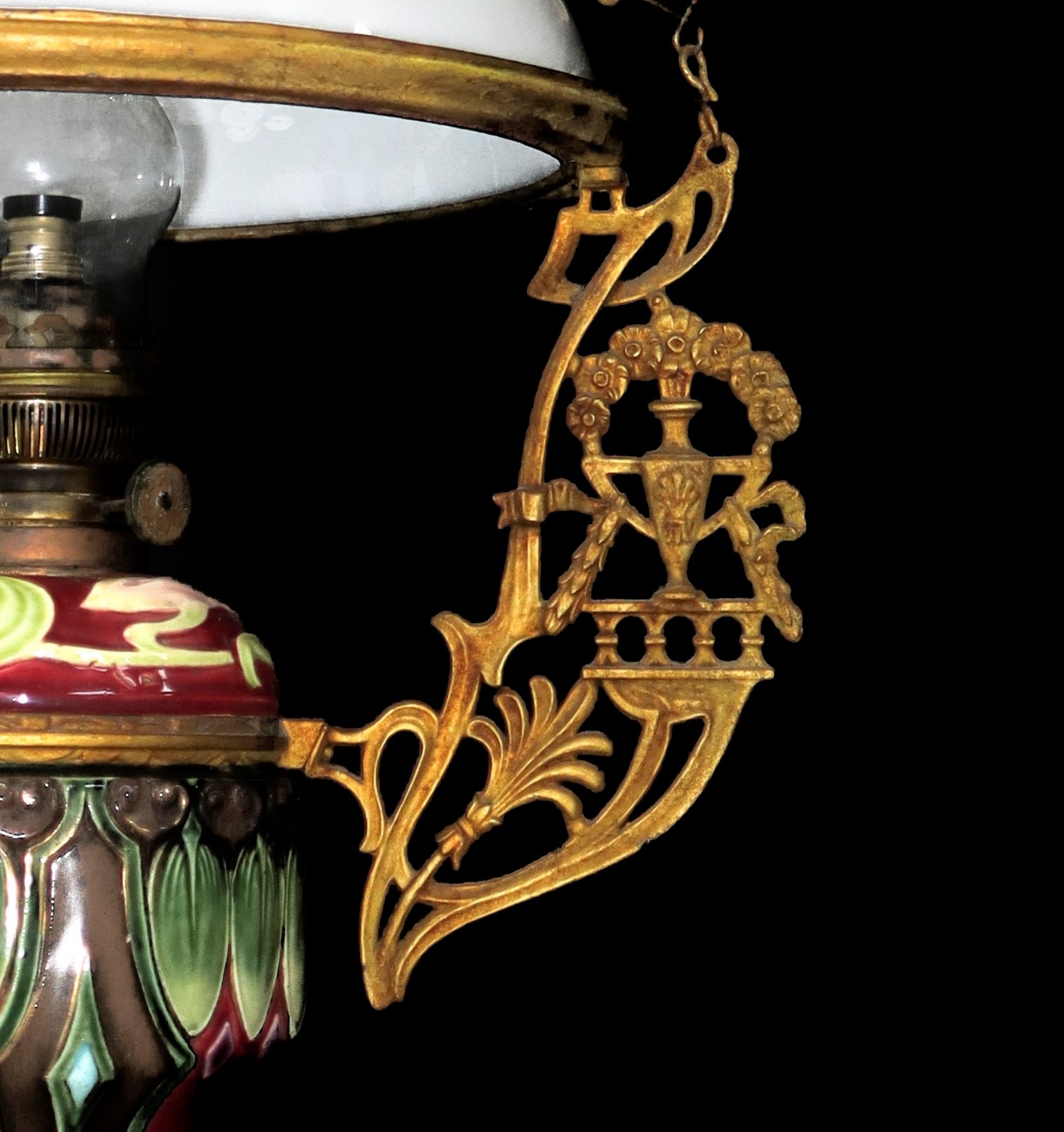 Lampadario a petrolio a sospensione, Early 20° secolo Elettrificato. Maiolica dipinta nello stile liberty e diffusore in opaline bianco, struttura in bronzo dorato.Elettrificato. Maiolica dipinta nello stile liberty e diffusore in opaline bianco, struttura in bronzo dorato.