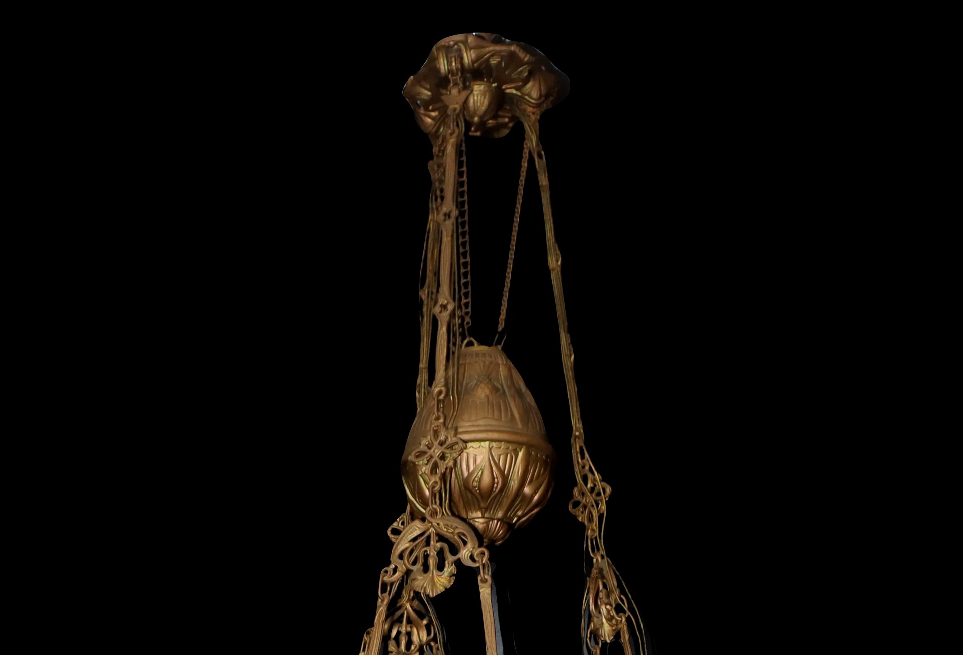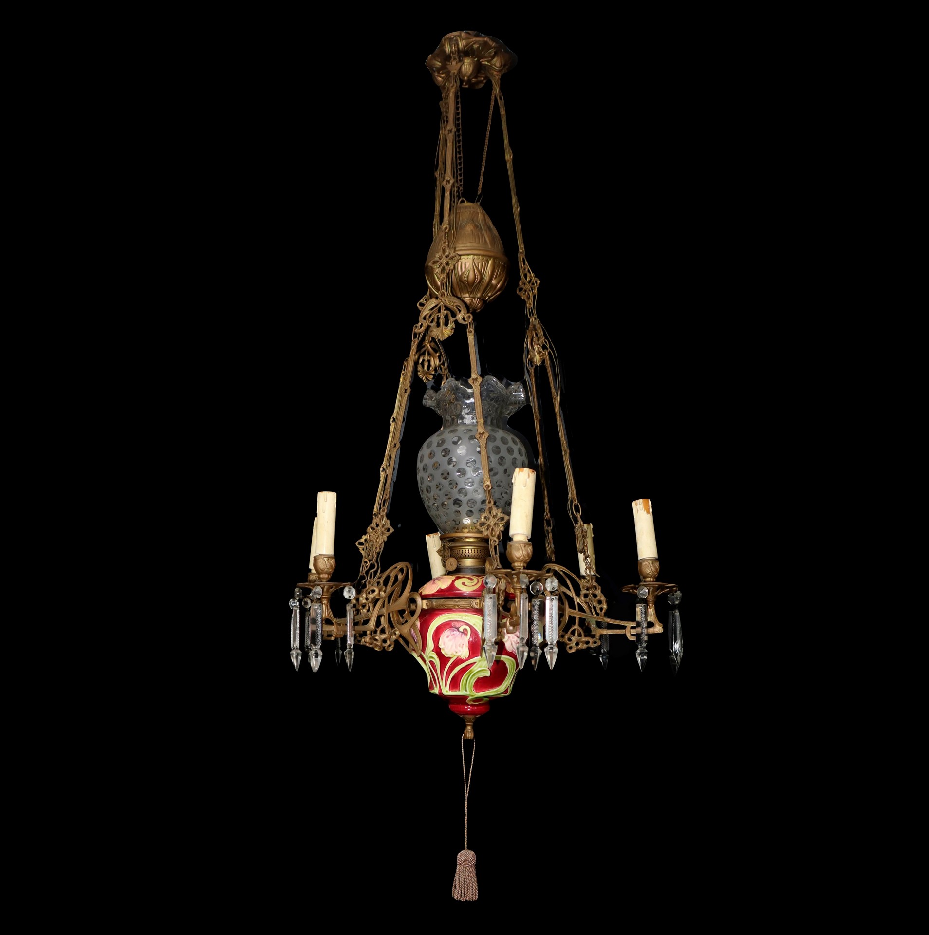 Elettrificato, contenitore in maiolica decorata liberty , diffusore in vetro a tulip, bronzo dorato .