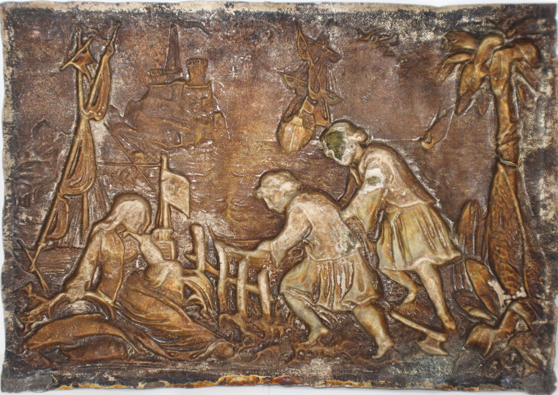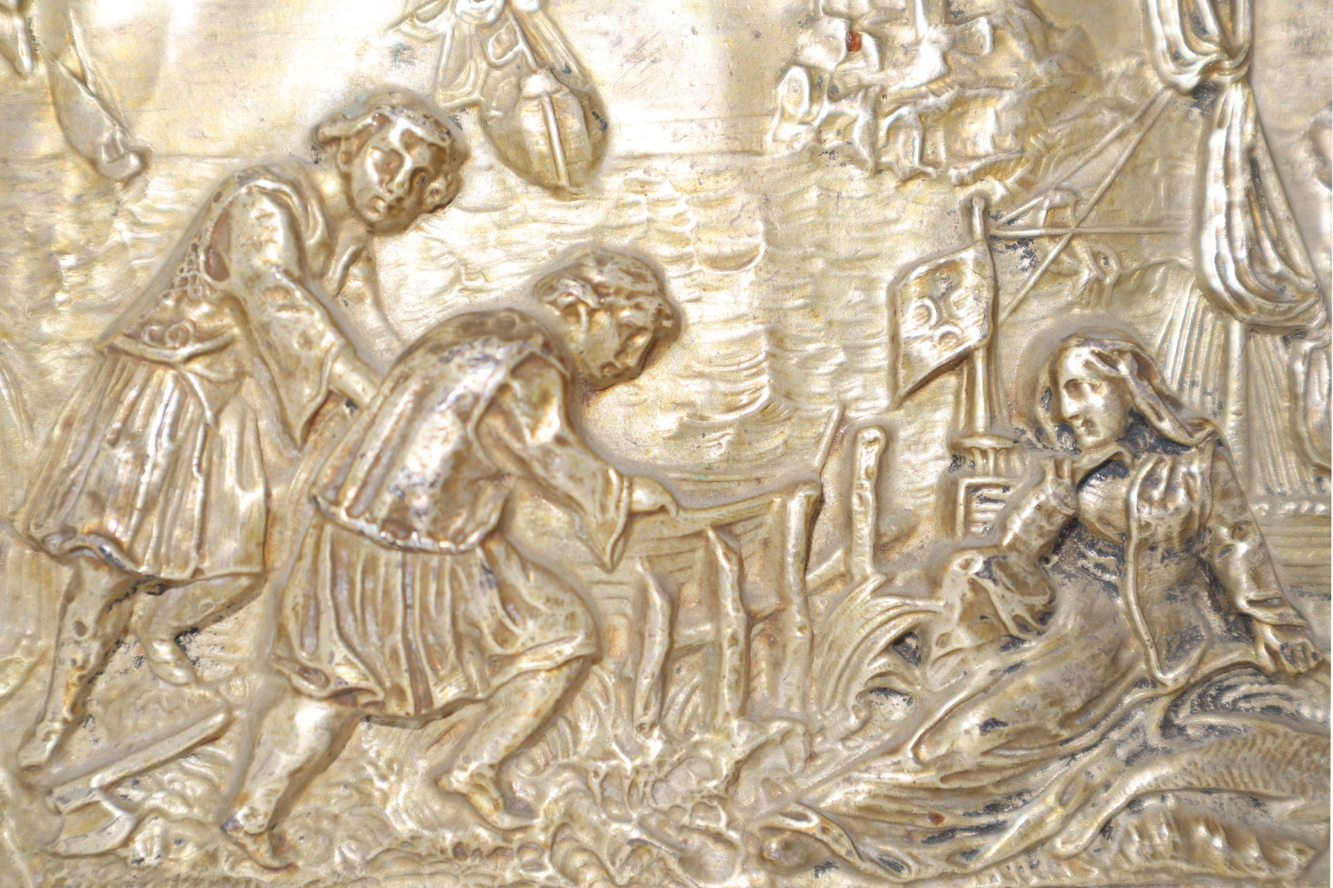 Placca in argento sbalzato vermeille raffigurante veliero con personaggi, late 18° secolo