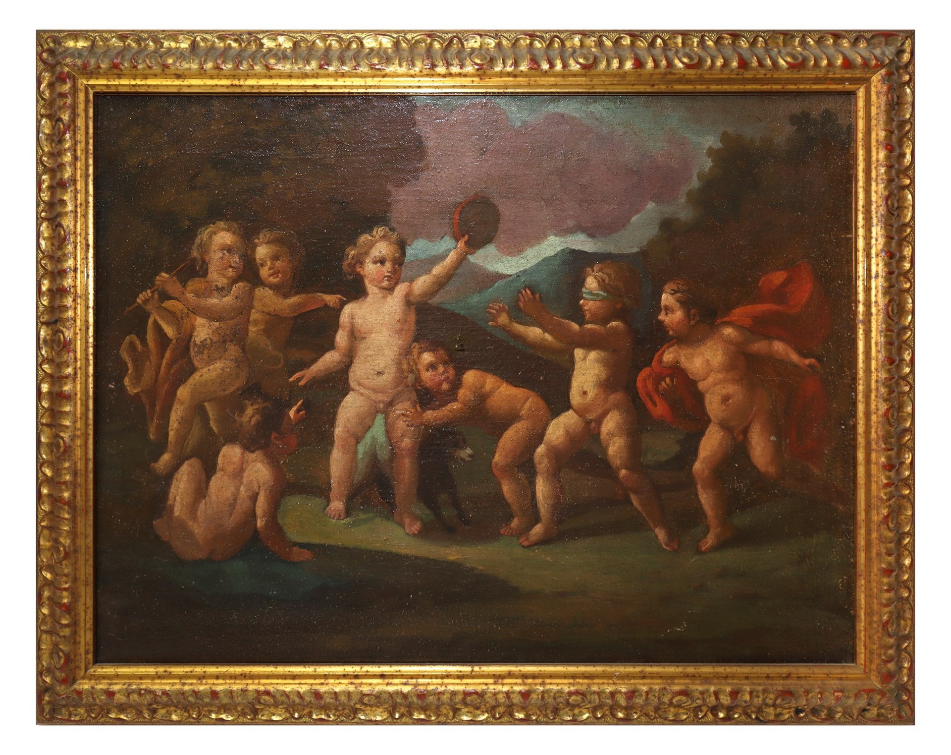 Gioco di putti, Late 18° secolo cm 37 x cm 49; in cornice cm 45 x cm 57 Dipinto ad olio su tela