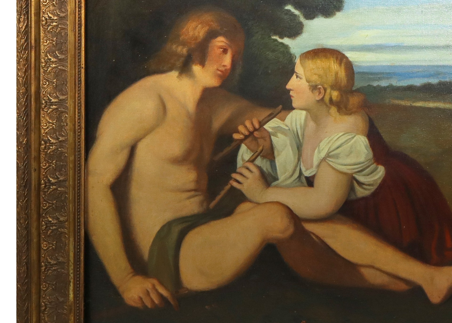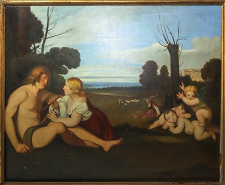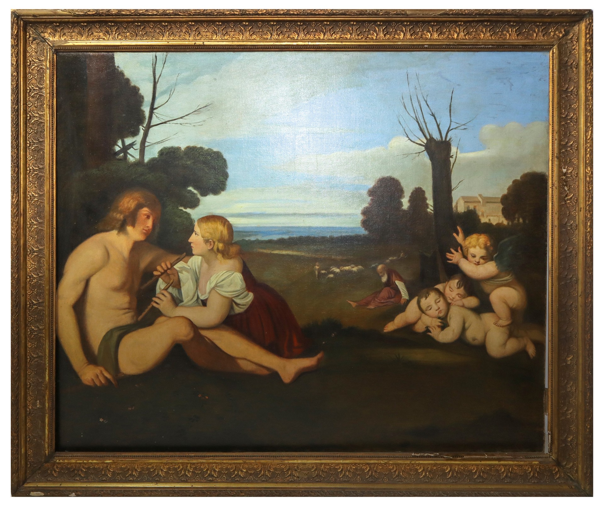 Le tre età dell'uomo, 19° secolo cm 101x126; in cornice cm 119x142 Olio su tela Da Tiziano Vecellio, pittore italiano del XIX secolo.