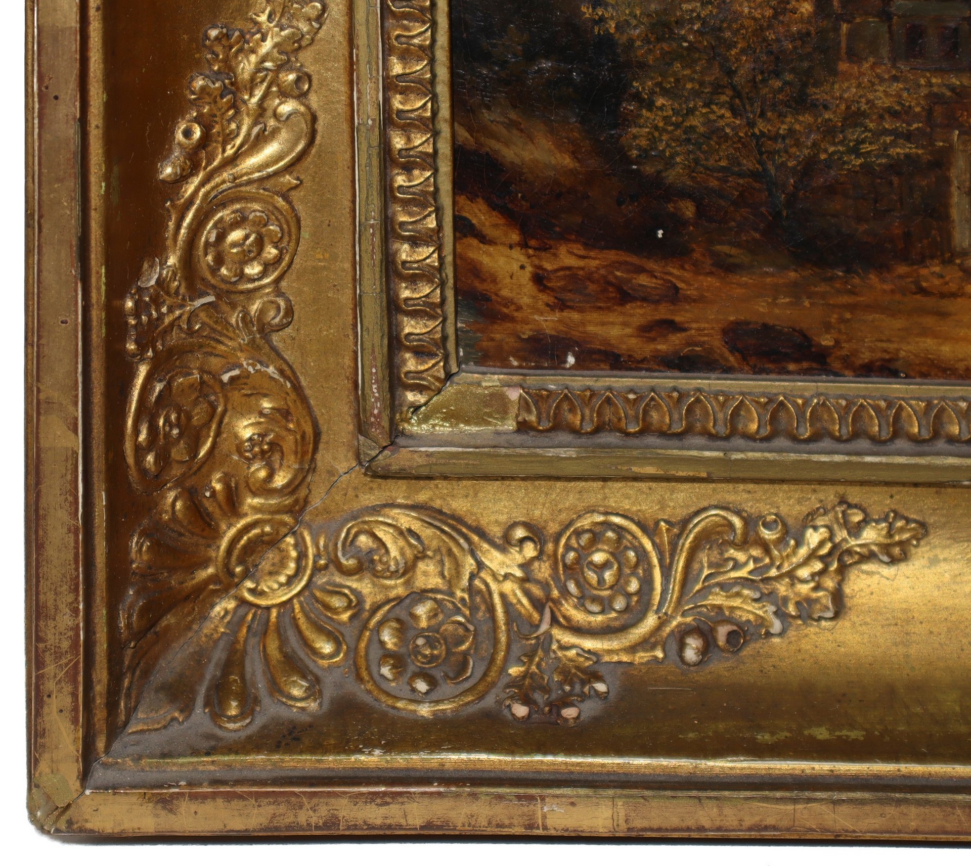 Paesaggio fluviale con rovine architettoniche cm 24 x cm 21; in cornice cm 36 x cm 33 Olio su tela Pittore del XIX secolo.