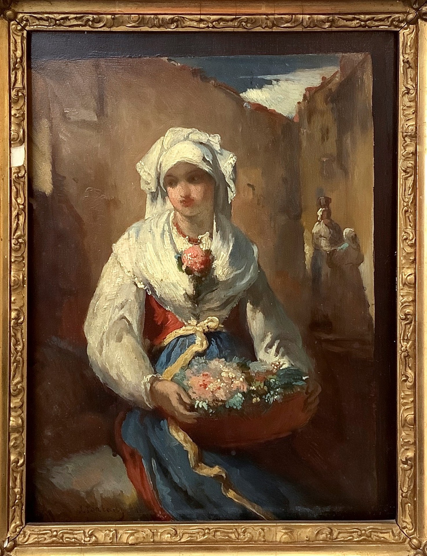 Jean-François Portaels (Vilvoorde 3 aprile 1818-Schaerbeek 8 febbraio 1895) - Ragazza in abiti popolari con vaso di fiori 30x23 in cornice 43x39 Olio su tavola