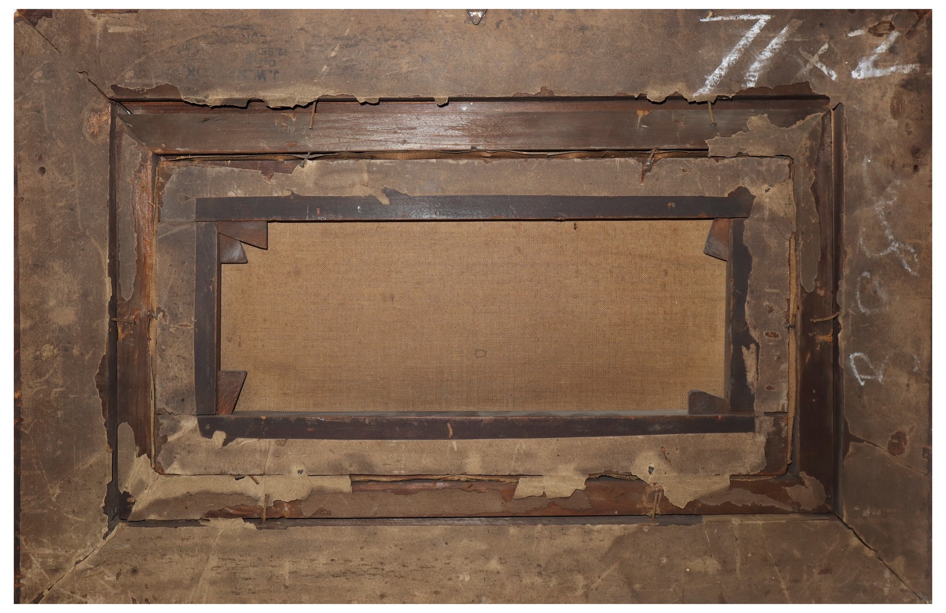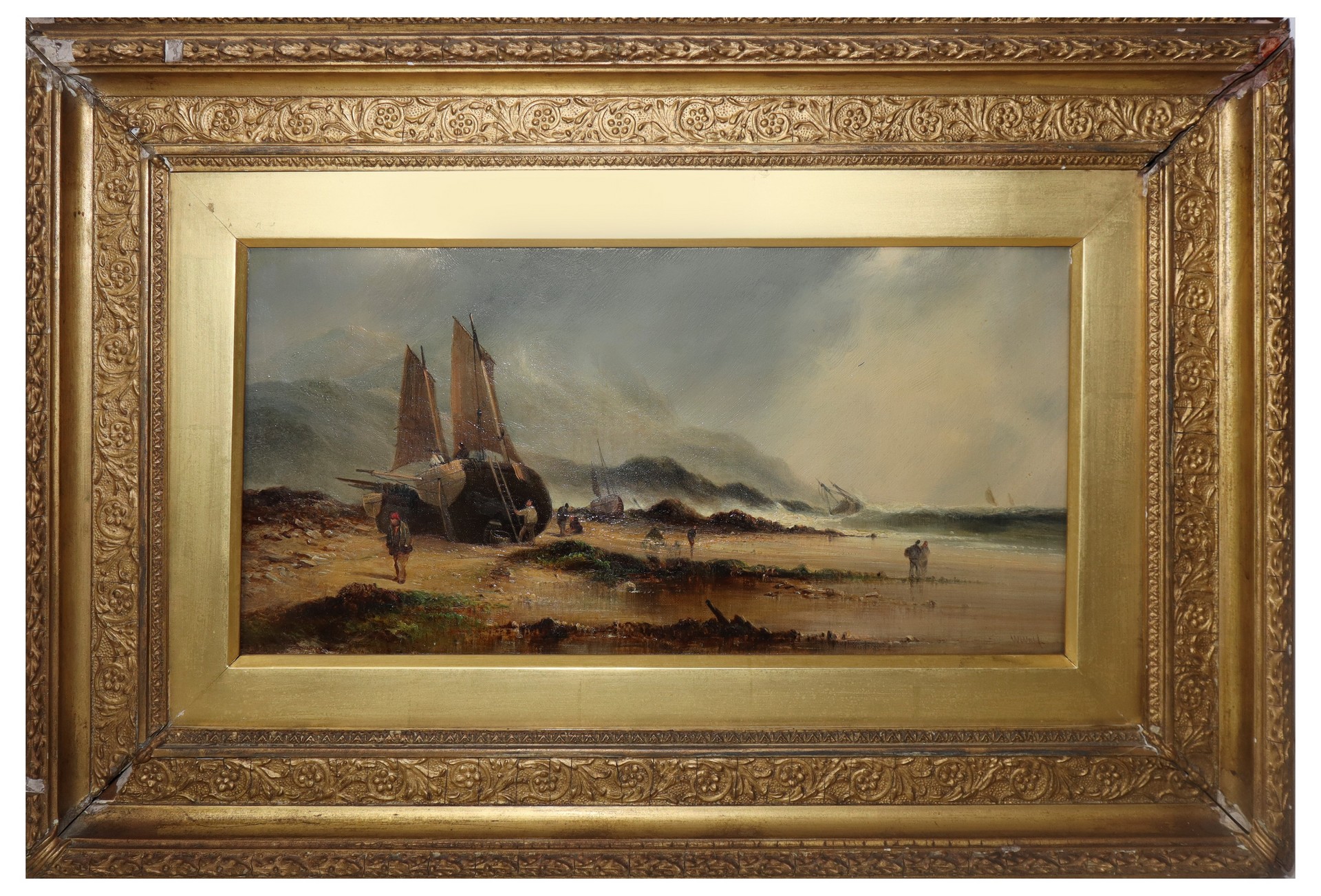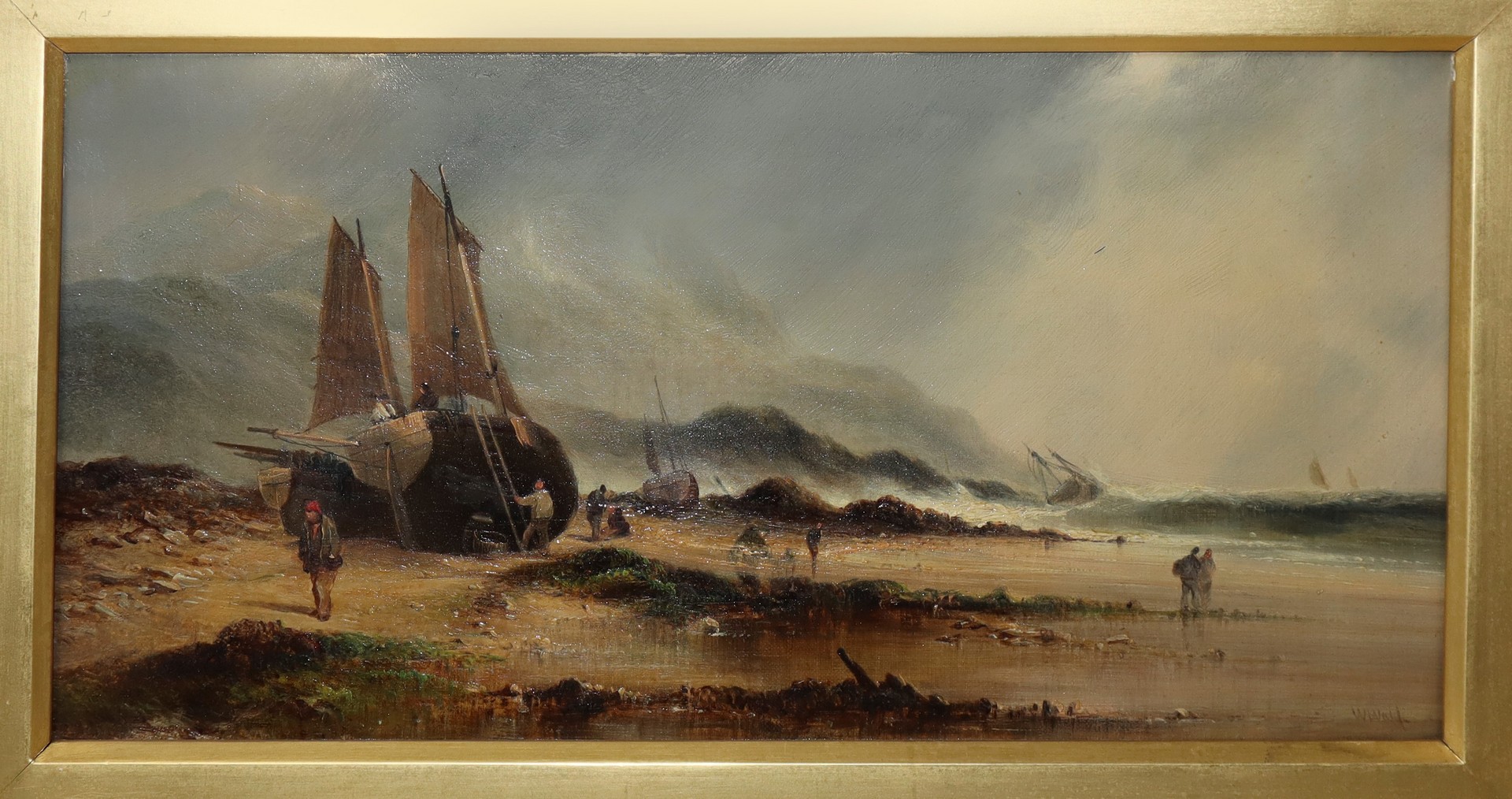 Tempesta con navi in mare, a secco e personaggi, 19° secolo cm 20x41; in cornice cm 41x51 olio su tela Pittore inglese del XIX Secolo, firmato in basso a destra W.Wolf