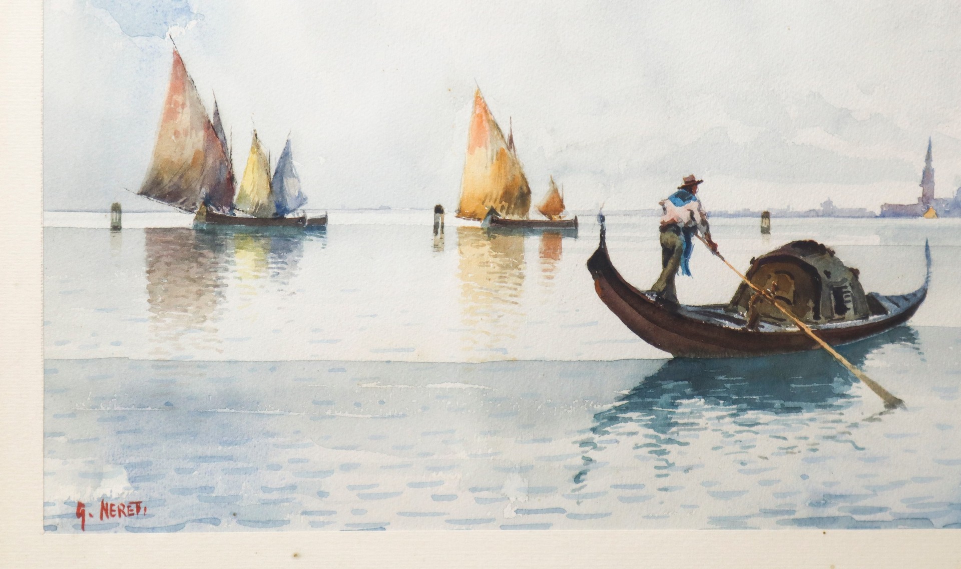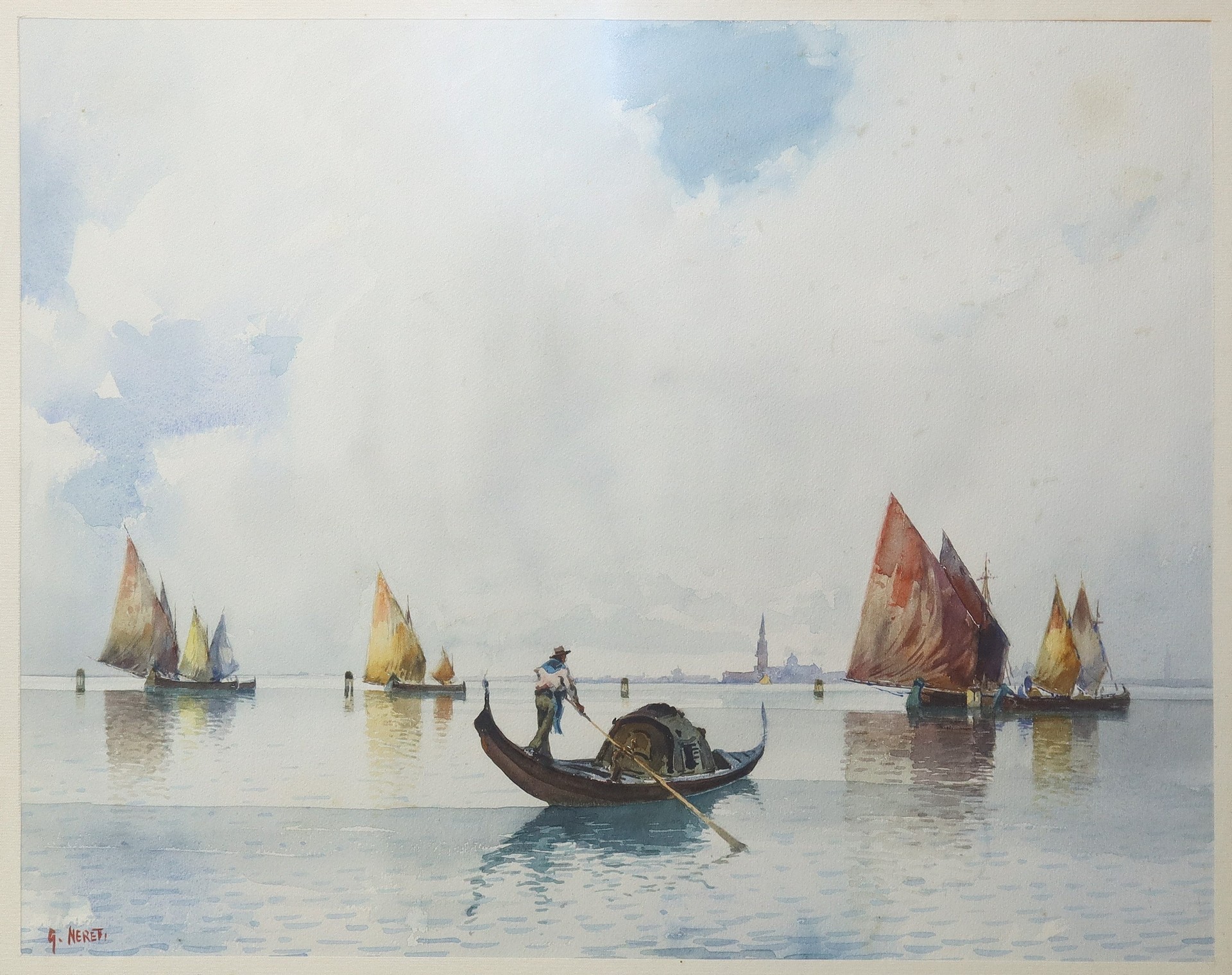 Gondola e barche sul mare di Venezia, 20° secolo cm h 37 x 46, in cornice h cm 57 x 67 Gouache su carta Firmato in basso a sinistra G.Meretti.