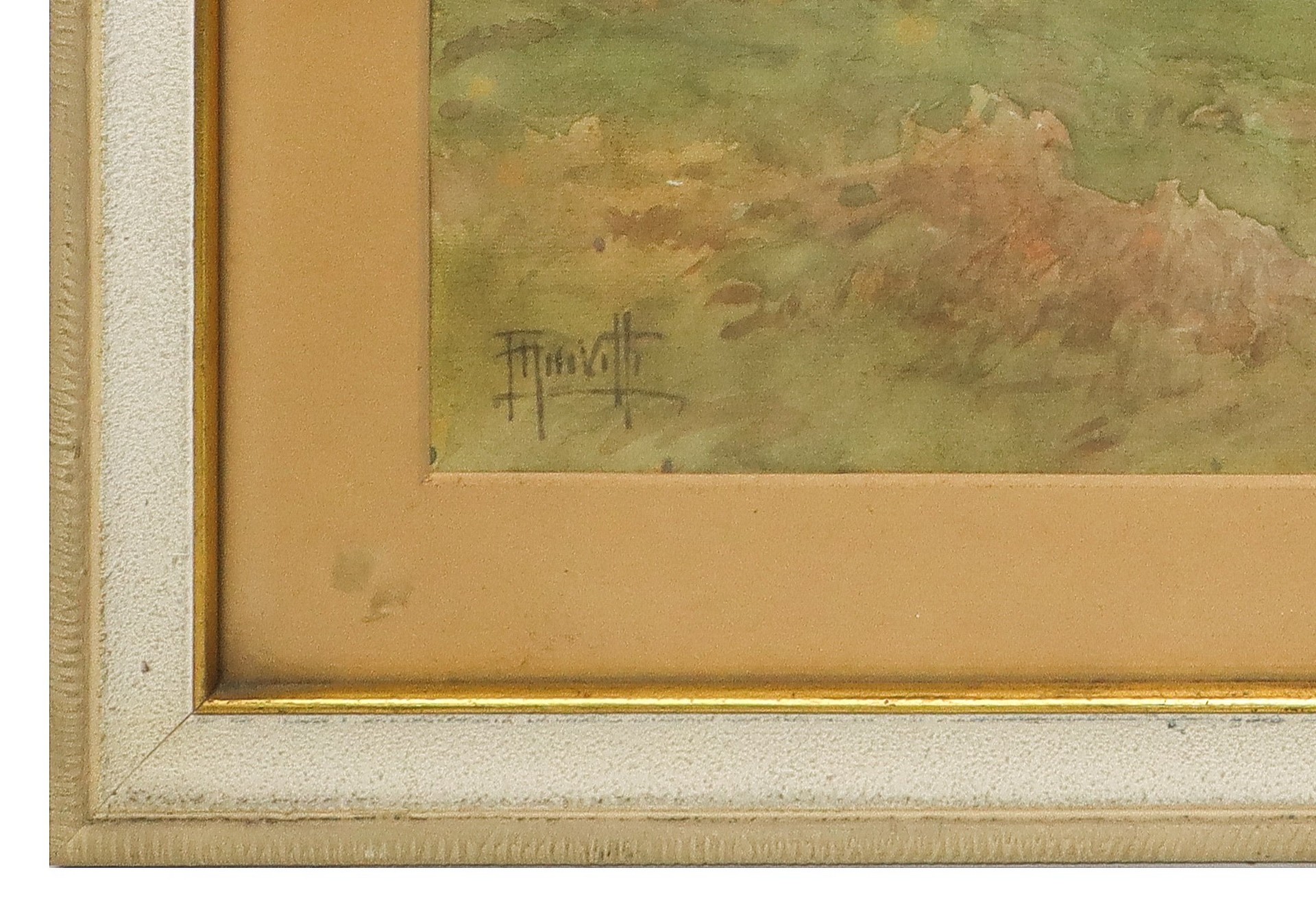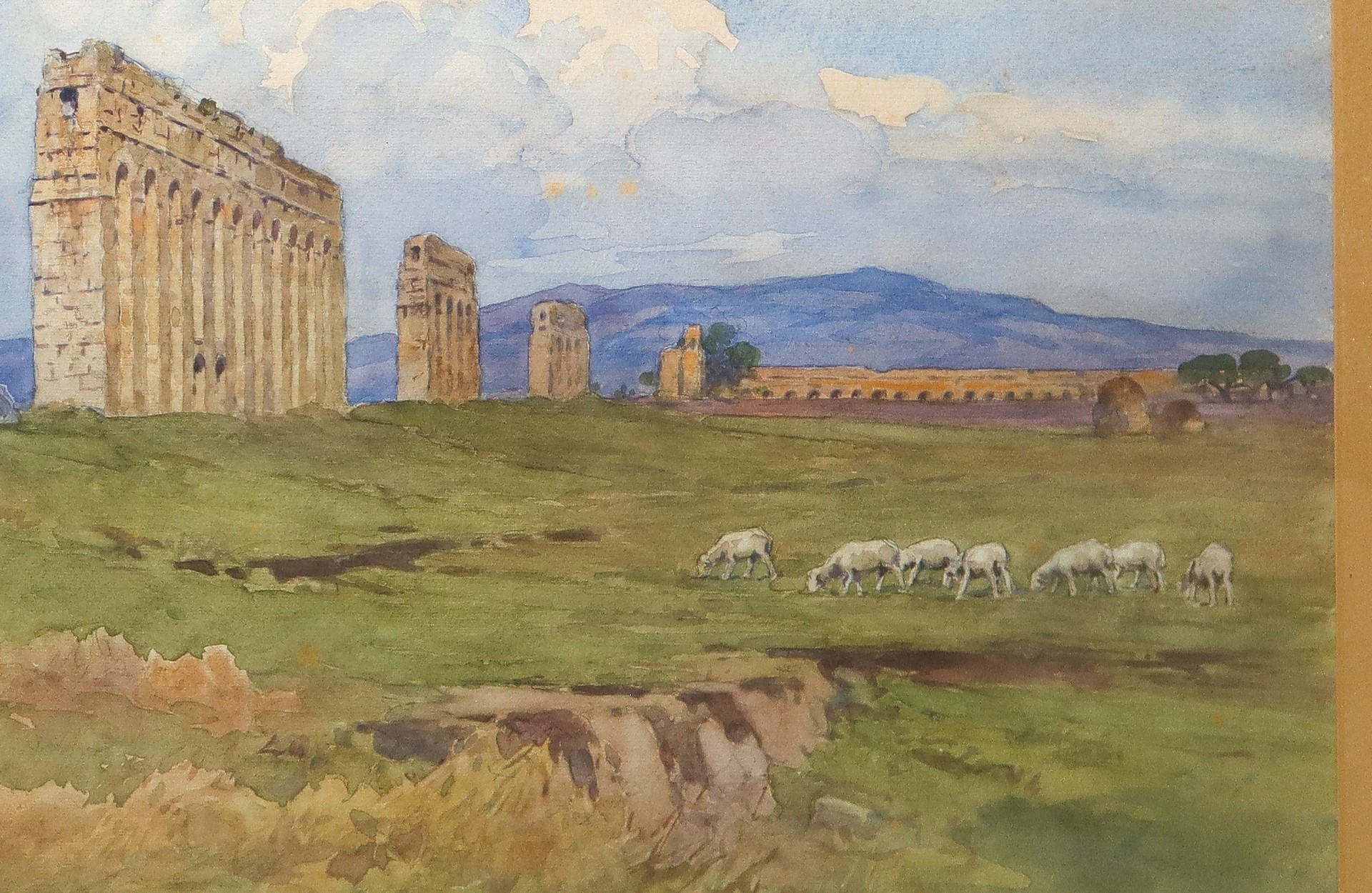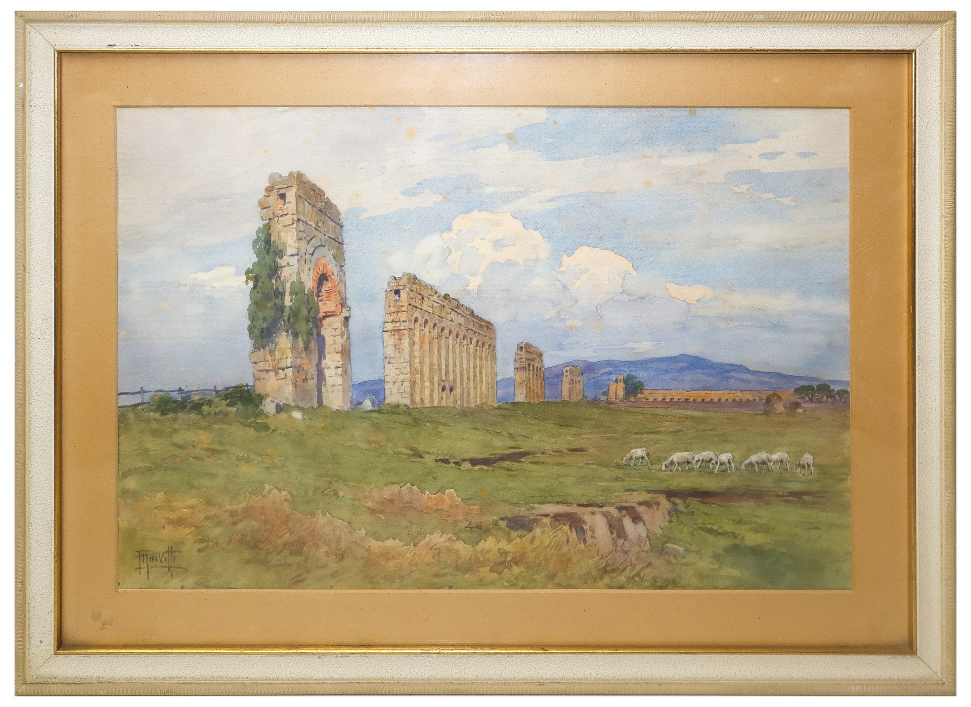 Paesaggio con ruderi romani e gregge al pascolo, Early 20° secolo Cm 39x59, incornice 55x75 Gouache su cartoncino Firmata in basso a sinistra.