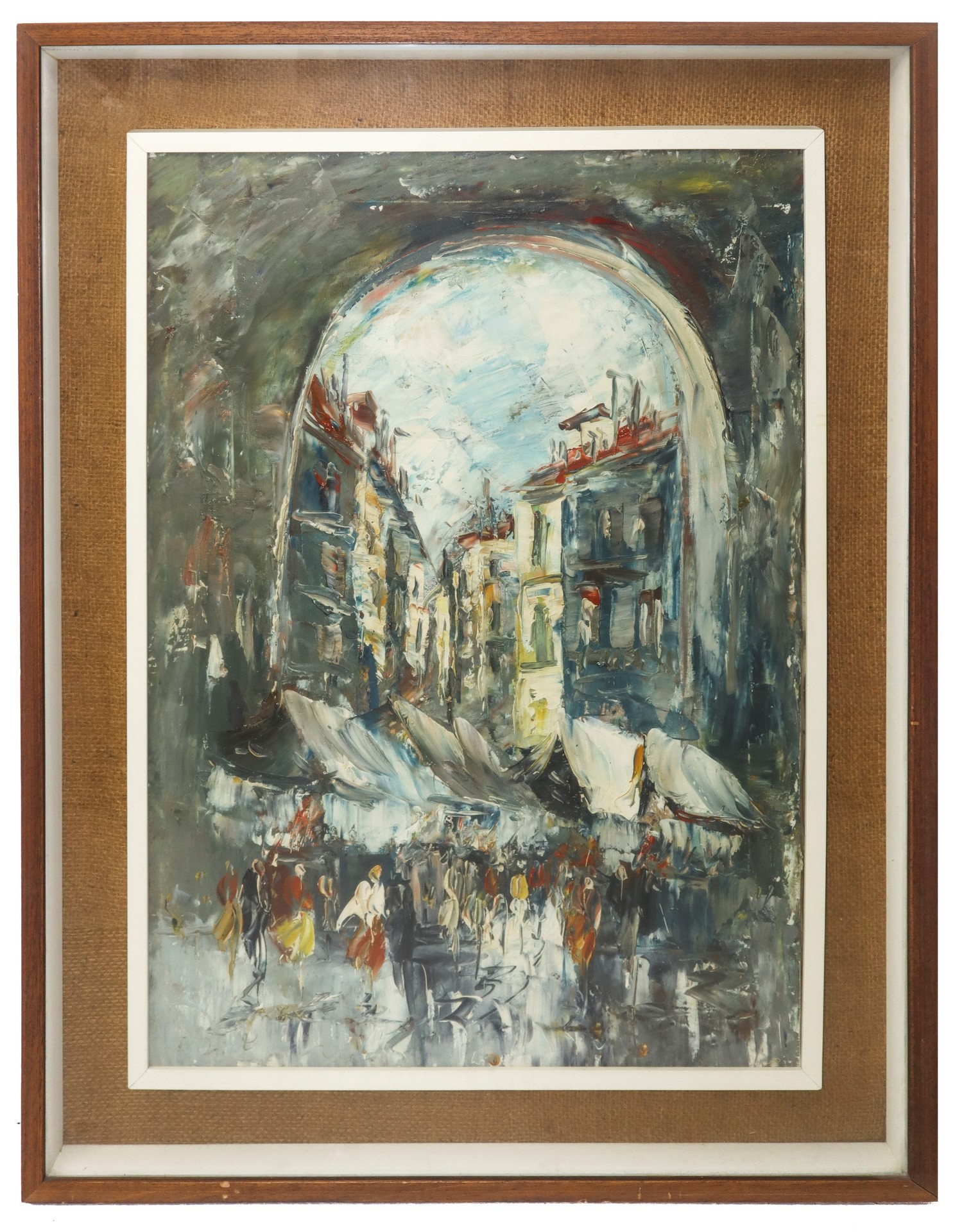 Scorcio di città con mercato sotto un arco, 20° secolo Cm 70x50, in cornice cm 88x78 Dipinto ad olio su tela