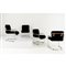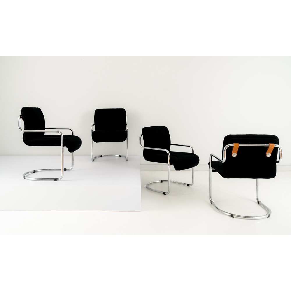Quattro poltrone in metallo tubolare cromato, seduta e spalliera in cuoio e tessuto nero.