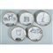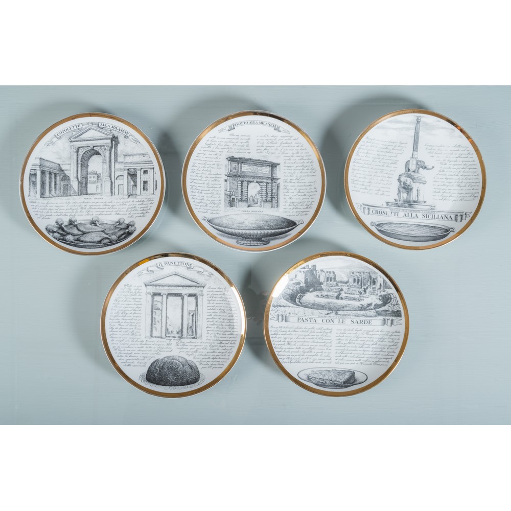 Cinque piatti della serie "Le glorie della cucina italiana" in porcellana e oro zecchino, tre piatti “Le specialità Milanesi”, due piatti “Le specialità Siciliane”. Marcati Fornasetti Milano Made in Italy e simbolo grafico.
