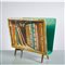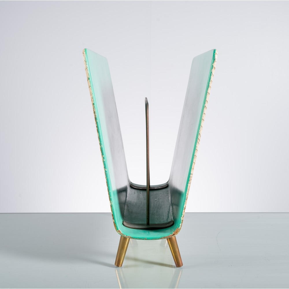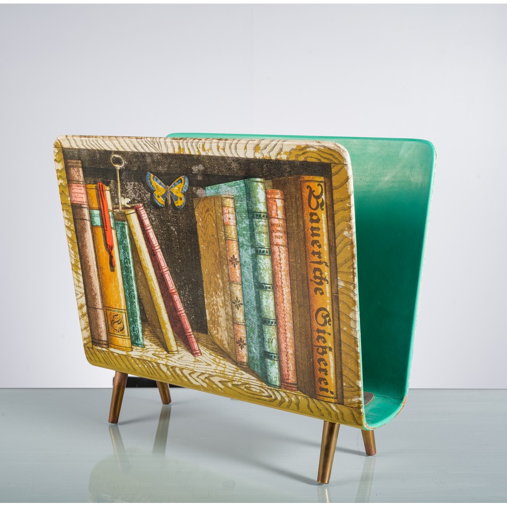 Portariviste in legno, decorato e dipinto a mano con un disegno ispirato al collezionismo di libri. Piedi e divisore interno in ottone. Segni del tempo.