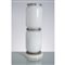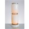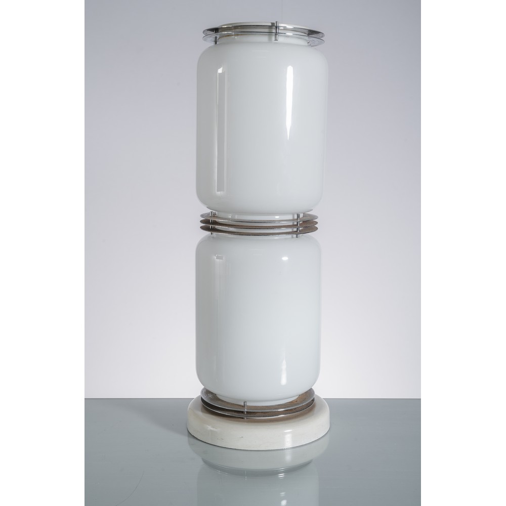 Lampada da tavolo o da terra a due luci, base circolare in metallo verniciato bianco, diffusori cilindrici in vetro lattimo separati da anelli in metallo cromato.