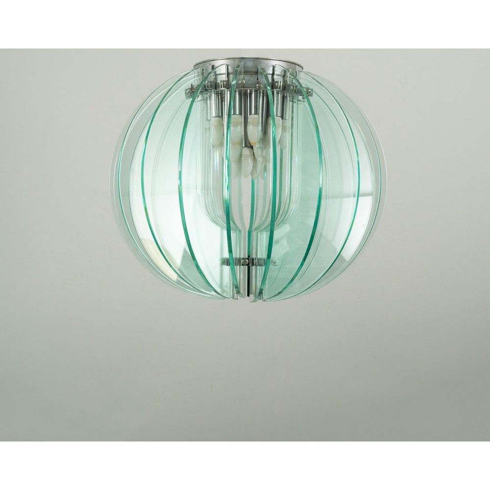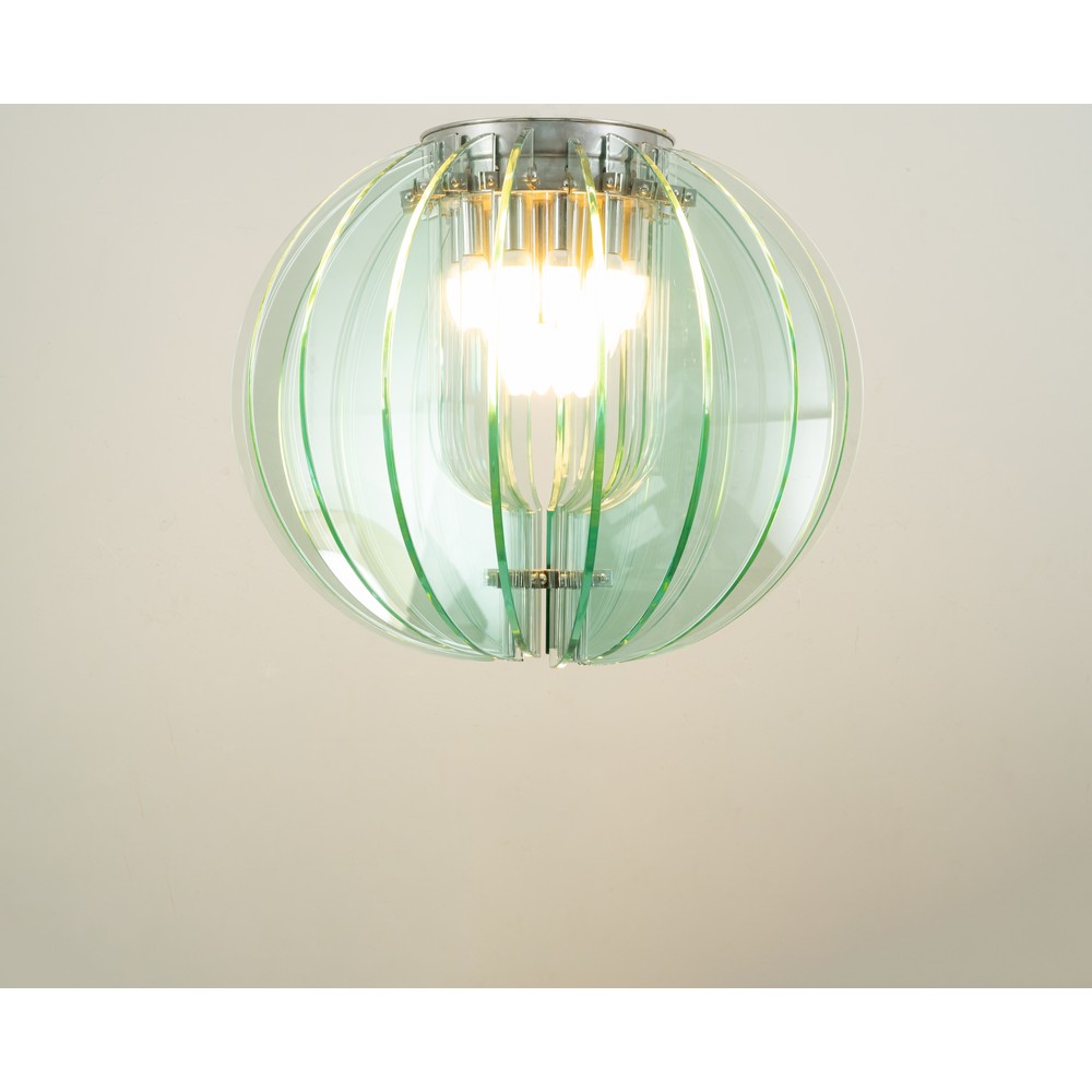 Lampada a sospensione a venti luci composta da vetri di grosso spessore montati in struttura metallica.