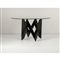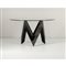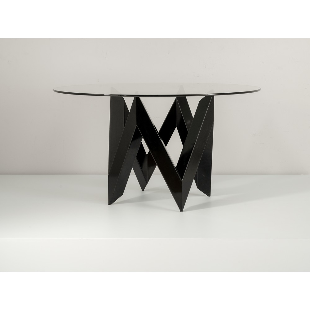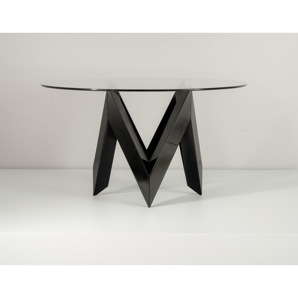 Tavolo da pranzo in legno laccato nero, piede composto da motivo a “V” continuo, piano circolare in cristallo di grosso spessore.