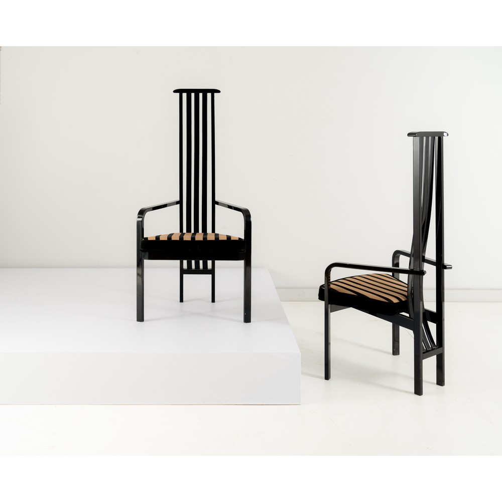 Coppia di sedie modello “Barbettis” in legno di faggio ebanizzato, alta spalliera con braccioli curvati, seduta imbottita in gommapiuma rivestita in tessuto a righe.