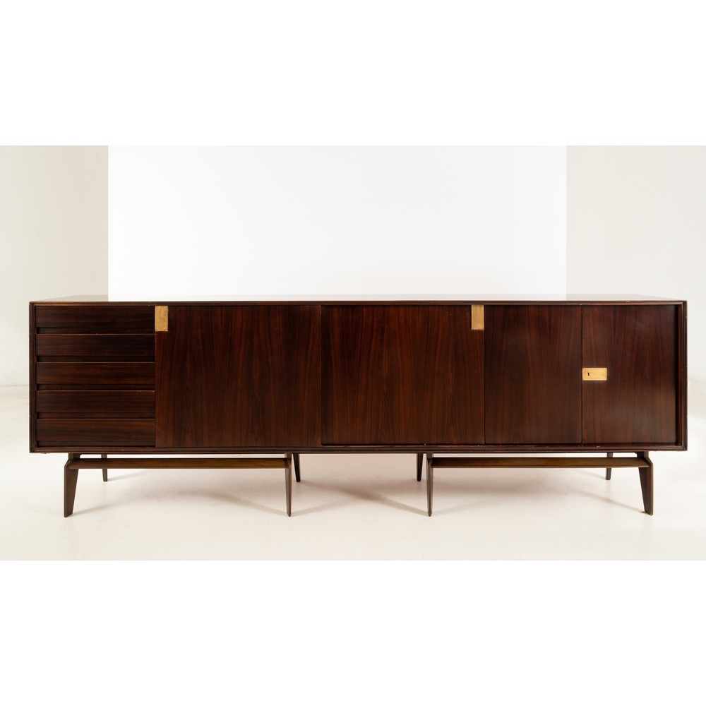 Sideboard in legno scuro, corpo rettangolare sorretto da otto piedi, suddiviso in tre vani, uno ad ante battenti con ripiano, uno con ante scorrevoli con ripiano ed uno con cinque cassetti, chiusure in ottone.