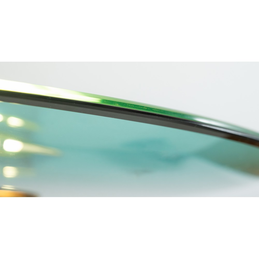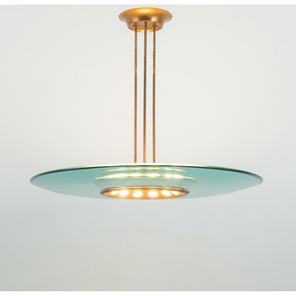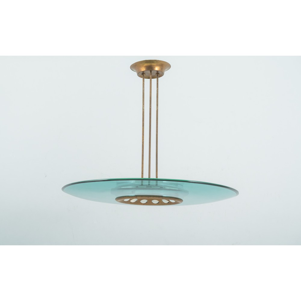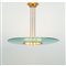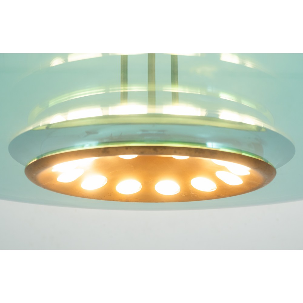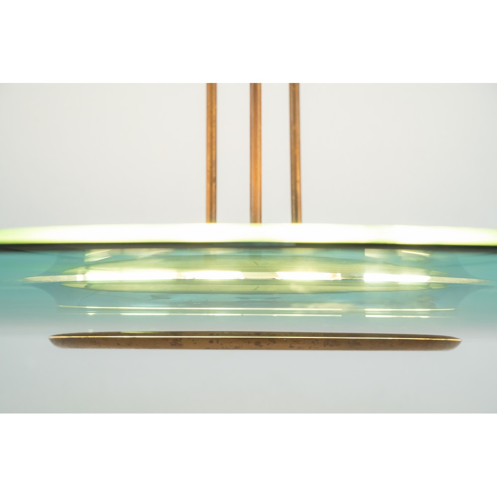 Lampada a sospensione modello “1508” a dodici luci, struttura in ottone, vetro di grosso spessore verde Nilo, corpo circolare.