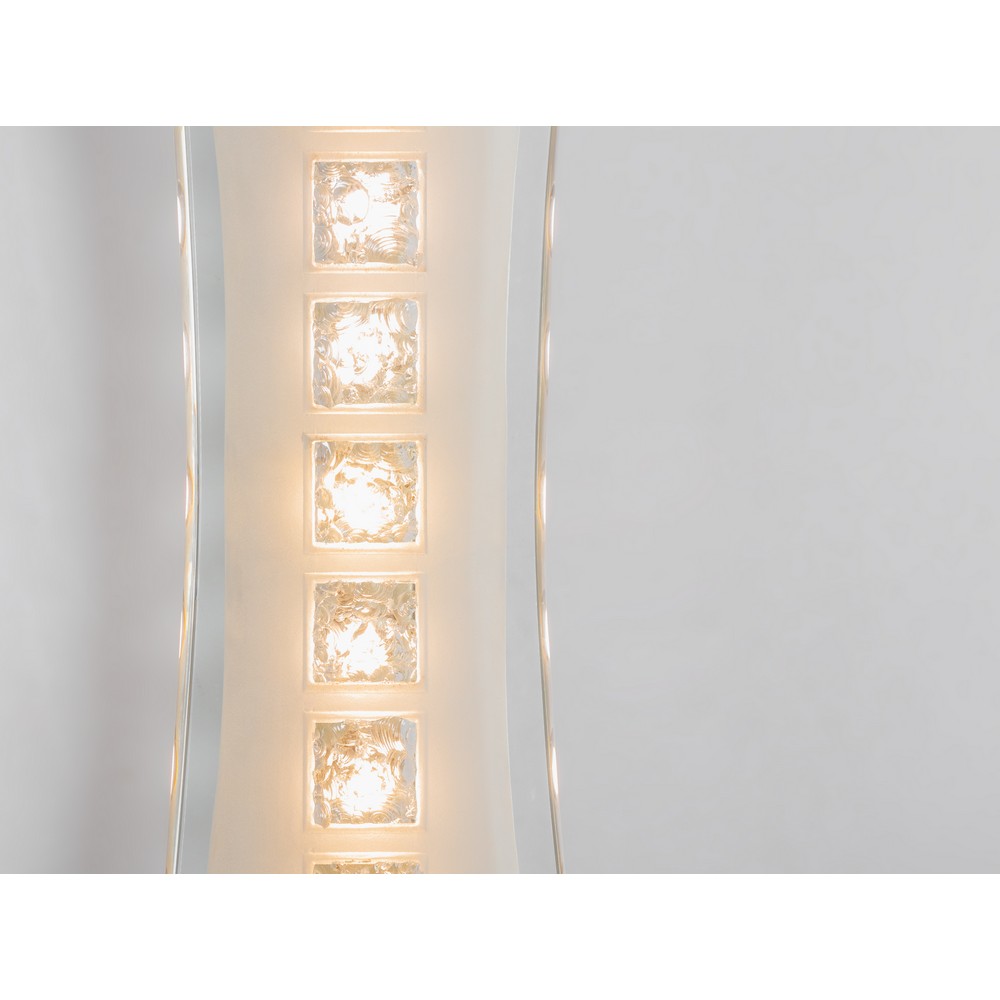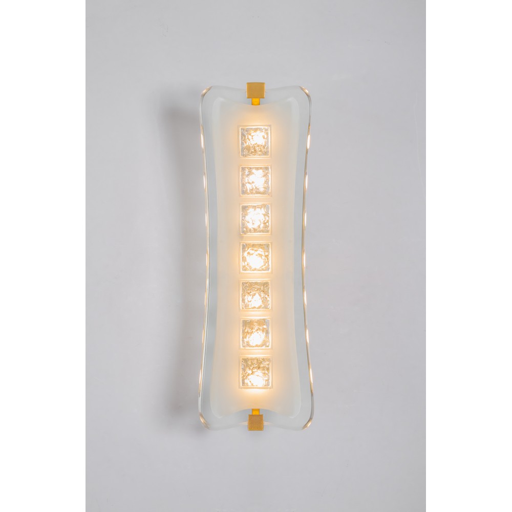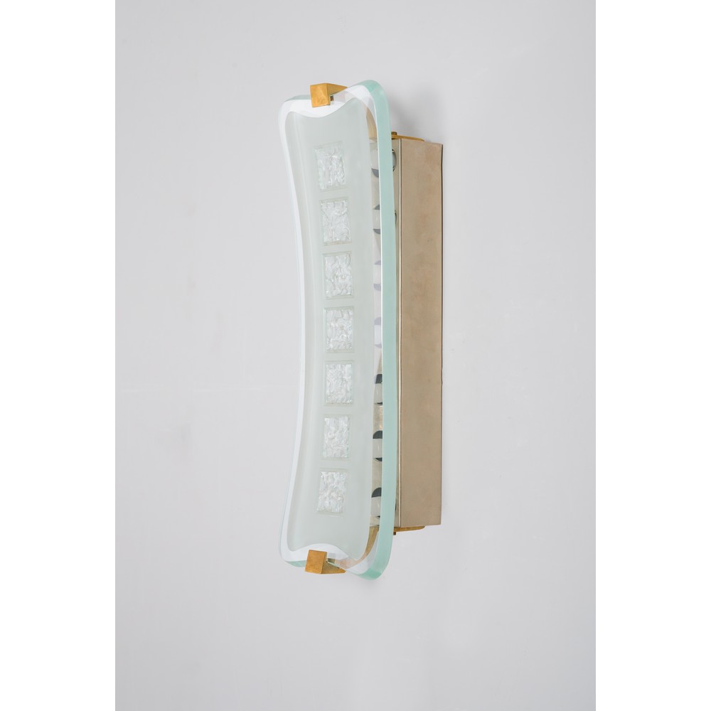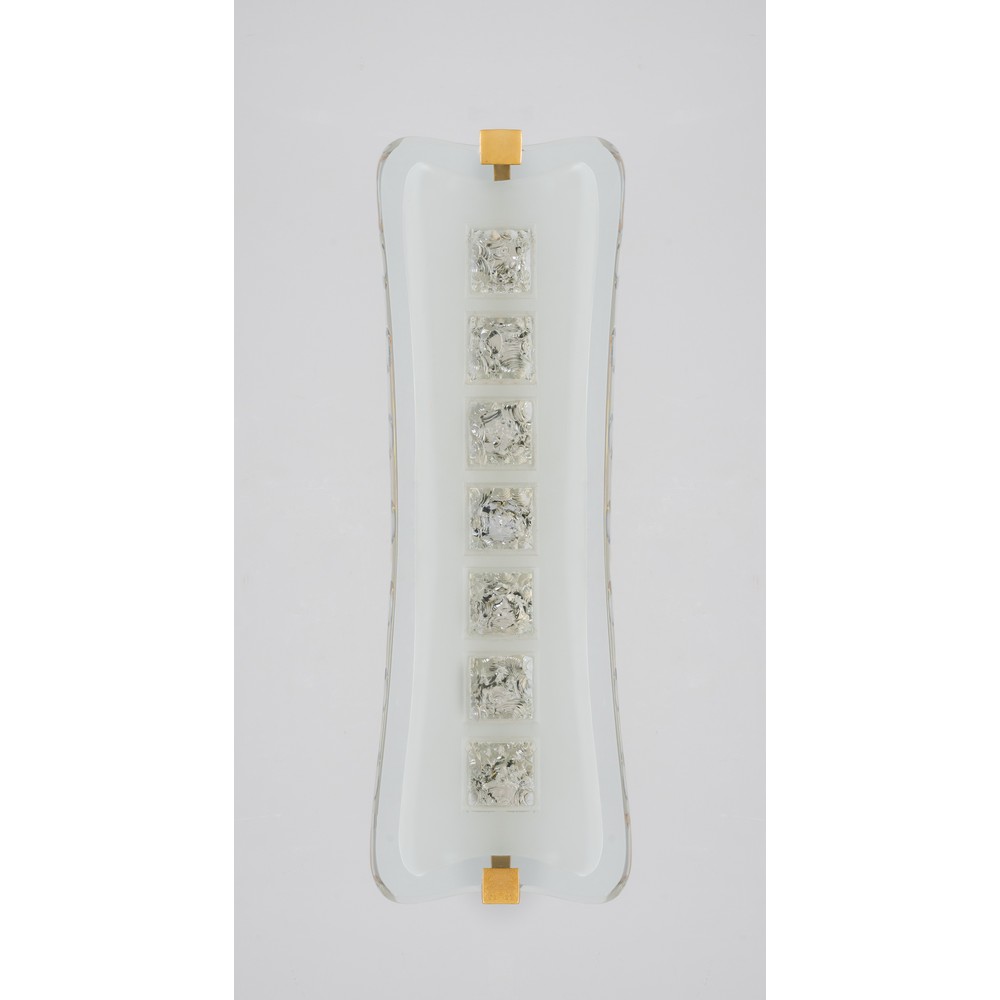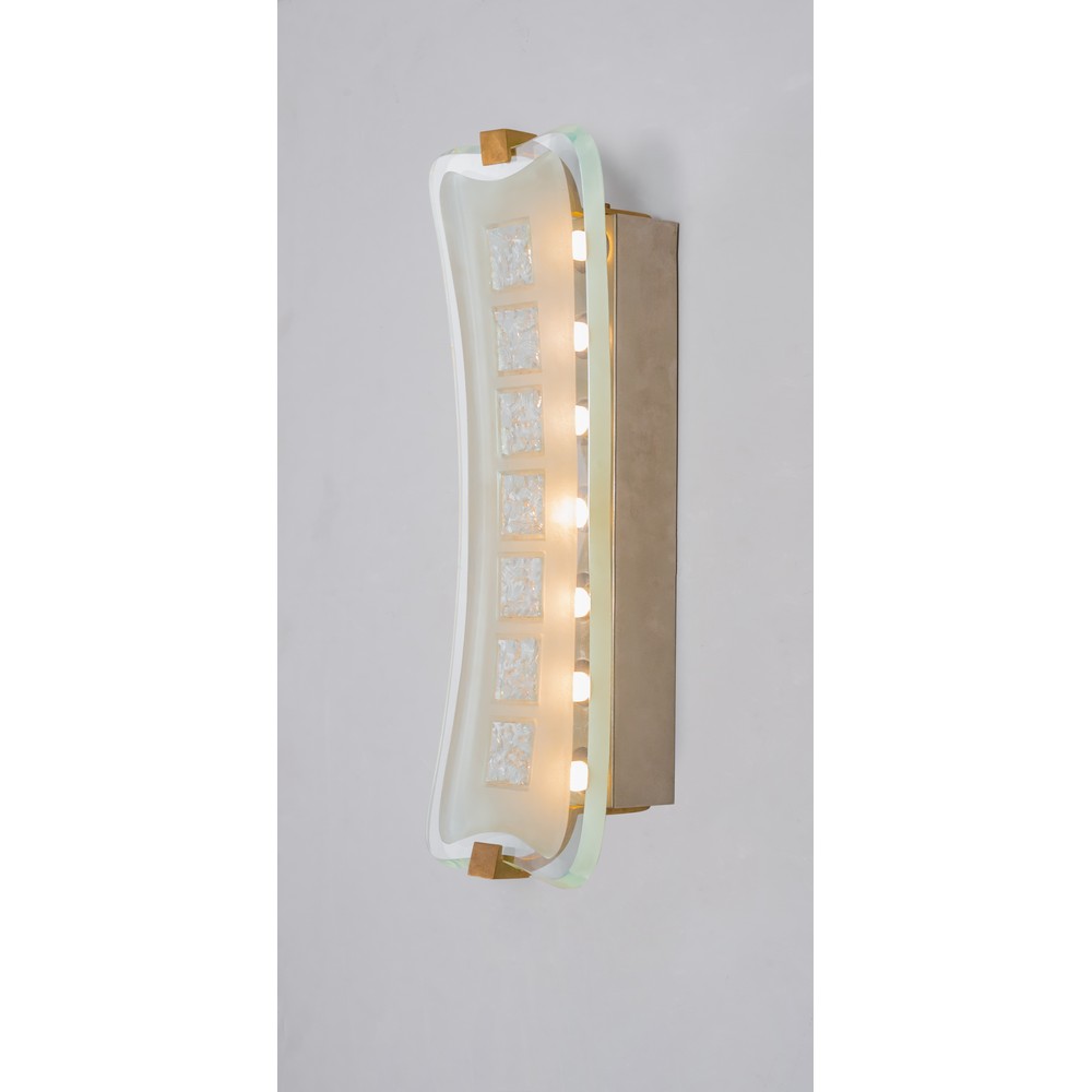 Lampada da parete a sette luci modello “1568”. Diffusore in cristallo curvato satinato con riquadri scalpellati. Montatura in ottone nichelato lucido.