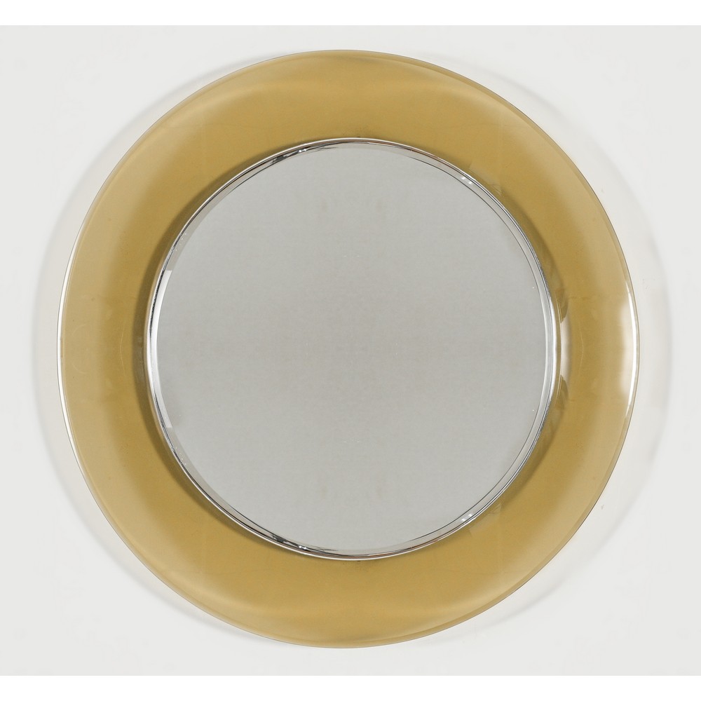 Specchio da parete modello "1669" di forma circolare in cristallo curvato e colorato fumè, molato e con bordo in ottone nichelato, cristallo specchiato.
