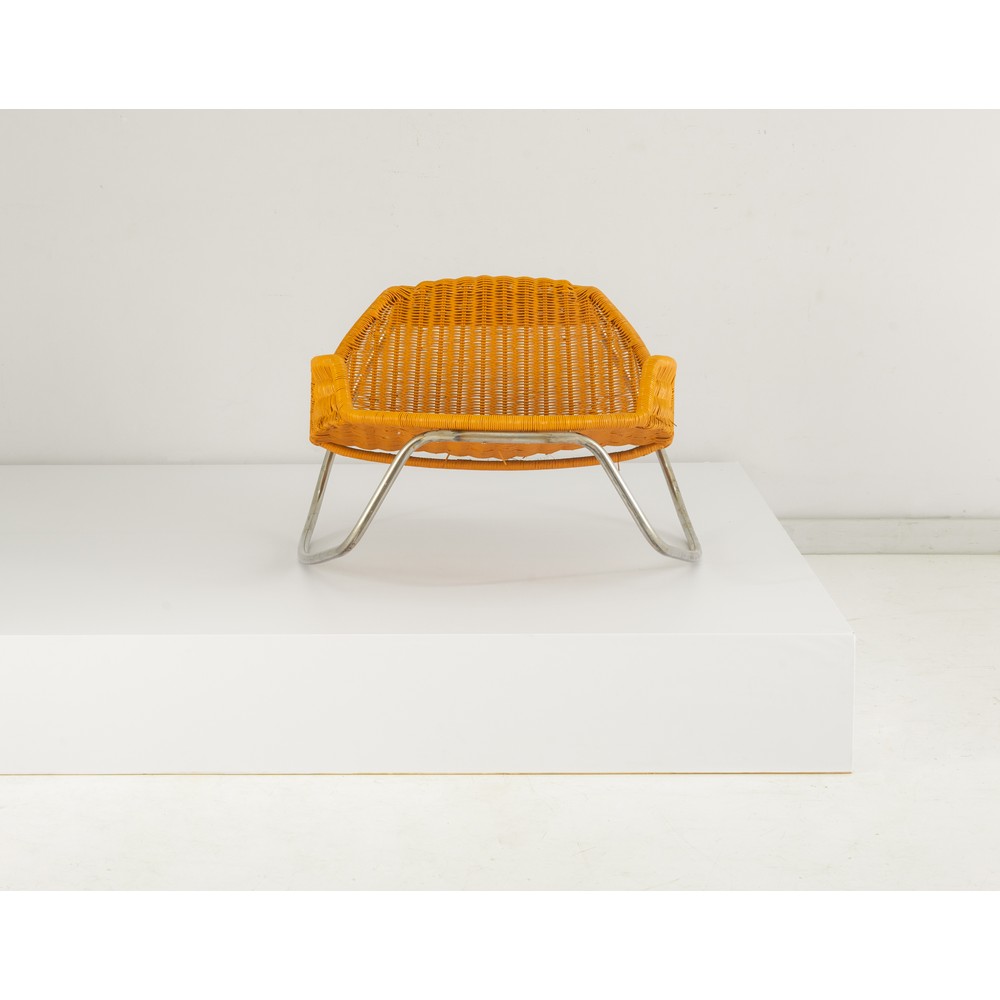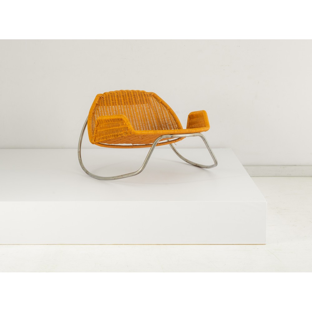 Rara poltrona basculante modello “Ondalunga”, struttura in metallo tubolare cromato, seduta e spalliera in midollino.