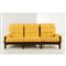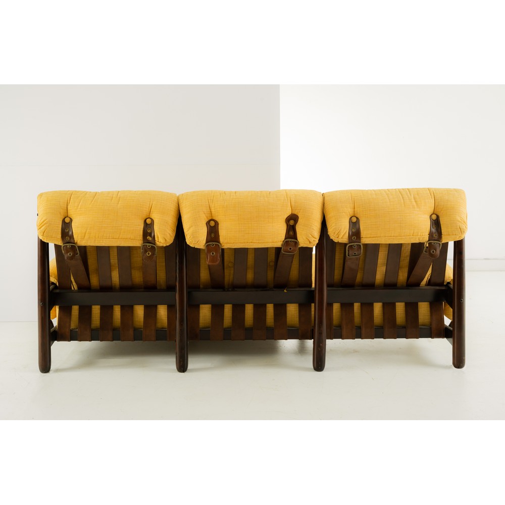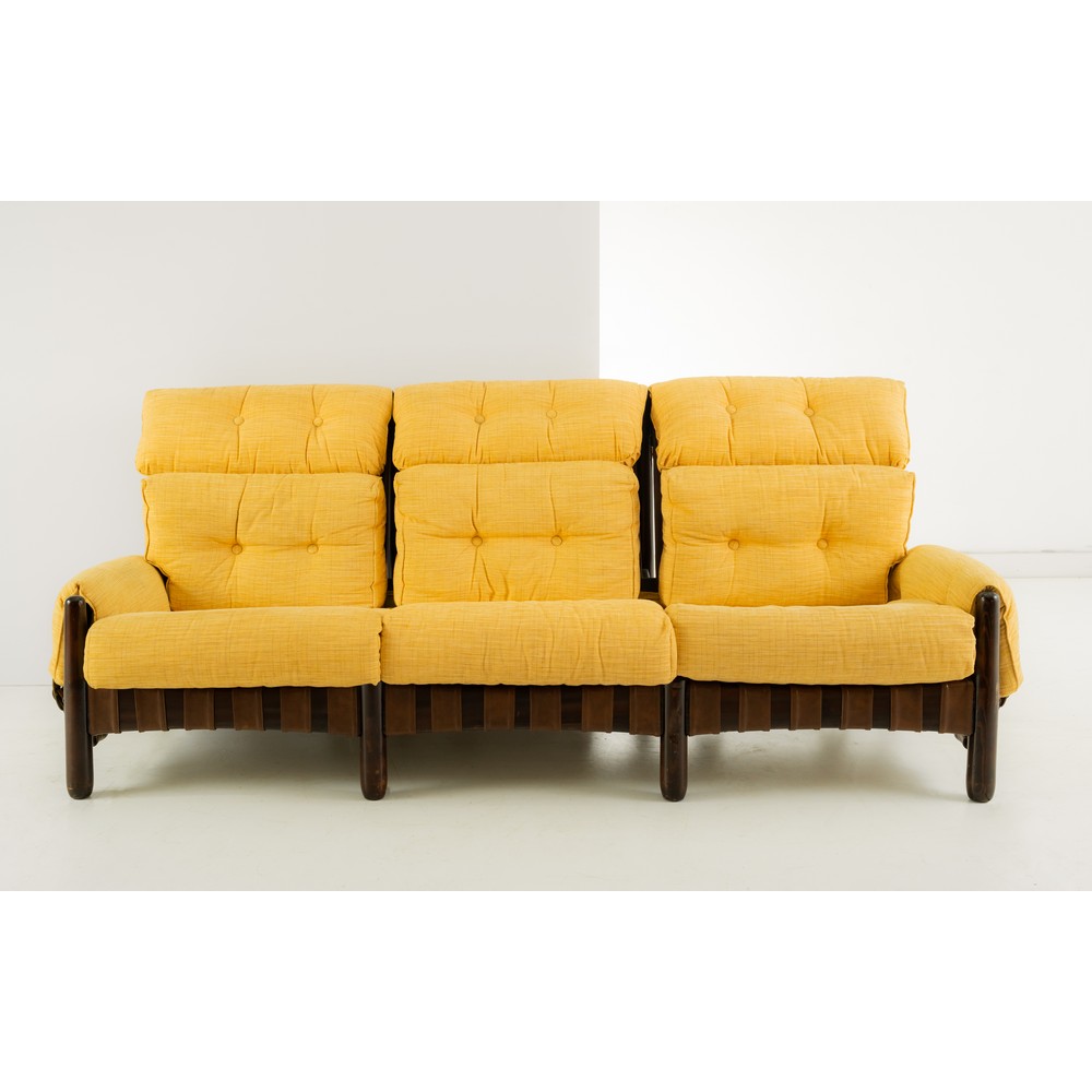 Divano in legno di noce brasiliana a tre posti, spalliera e seduta sostenuta da cinghie in cuoio regolabili con fibbie, cuscini imbottiti e rivestiti con tessuto giallo. Usure.