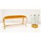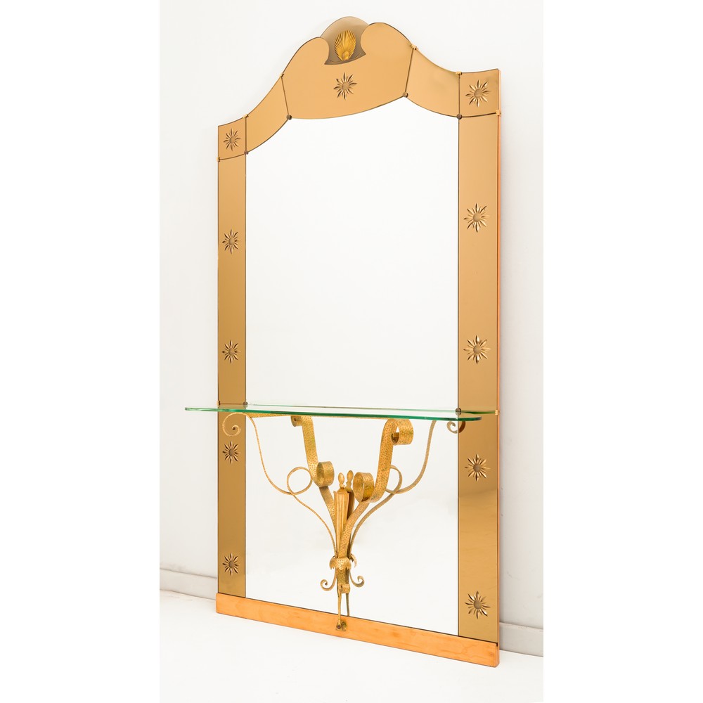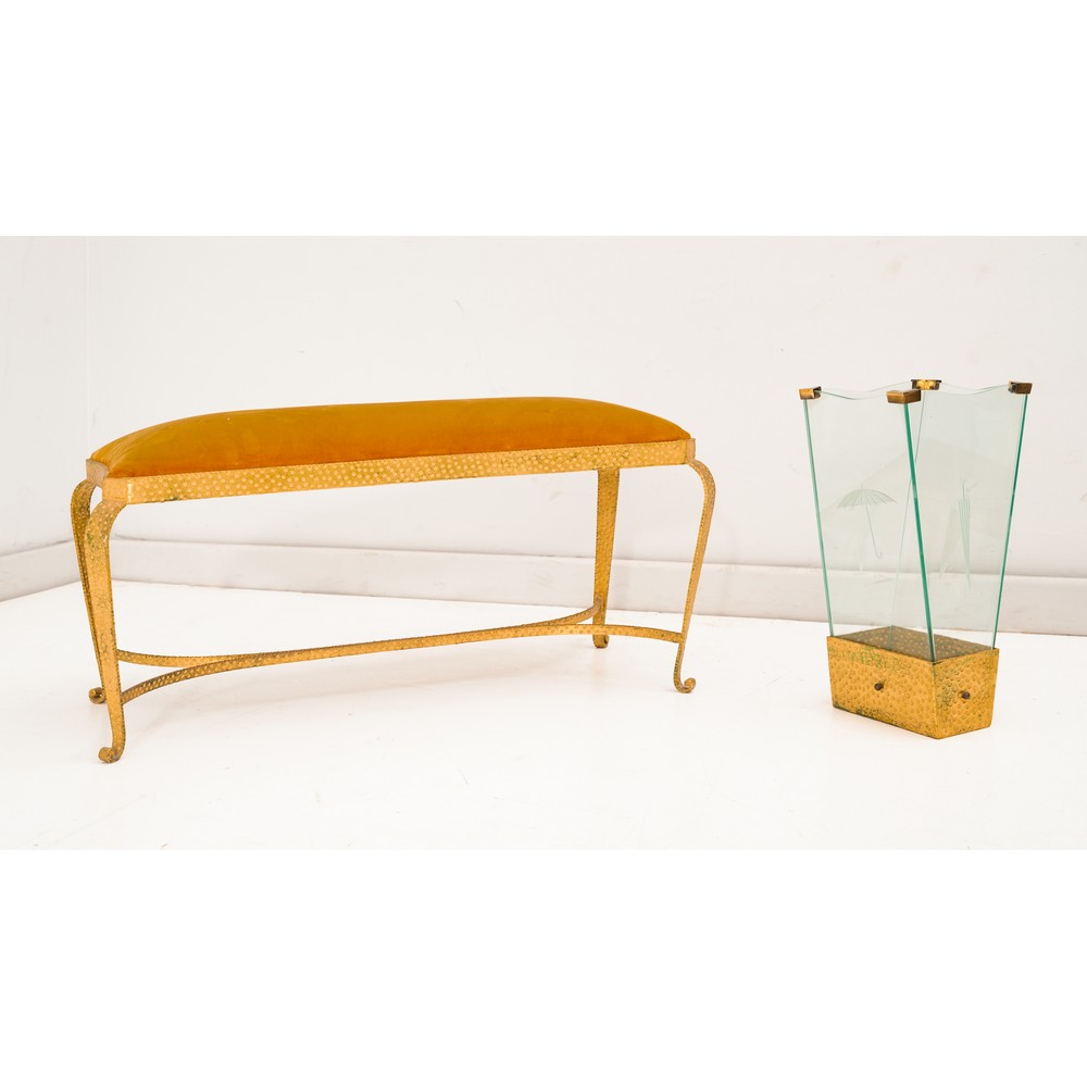 Grande specchio da parete in cristallo specchiato e dorato, inciso, molato e decorato con stelle, sul fronte una consolle in metallo dorato e martellato con mensola in vetro incolore di grosso spessore. Una panca in metallo dorato e martellato con seduta imbottita e rivestita con tessuto di velluto nei toni aragosta. Un portaombrelli in metallo dorato e martellato con vetri trasparenti e incisi a decoro di ombrelli.