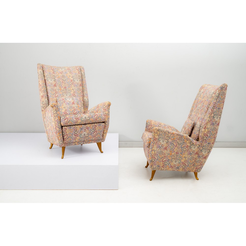 Coppia di poltrone modello “408” struttura in legno con imbottitura e rivestimento in tessuto chiaro con fiori policromi, piedi dorati.