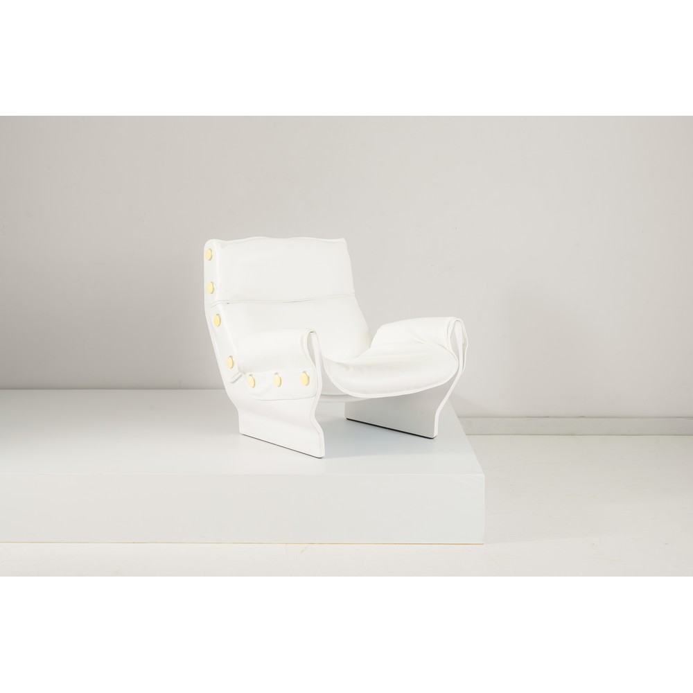 Poltrona modello “P110” o “Canada”, struttura in compensato curvo verniciato bianco, spalliera e seduta con imbottitura e rivestimento in pelle bianca.
