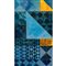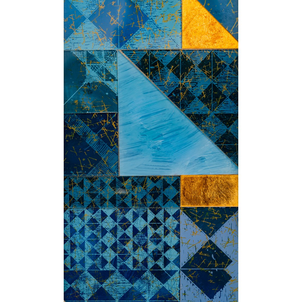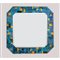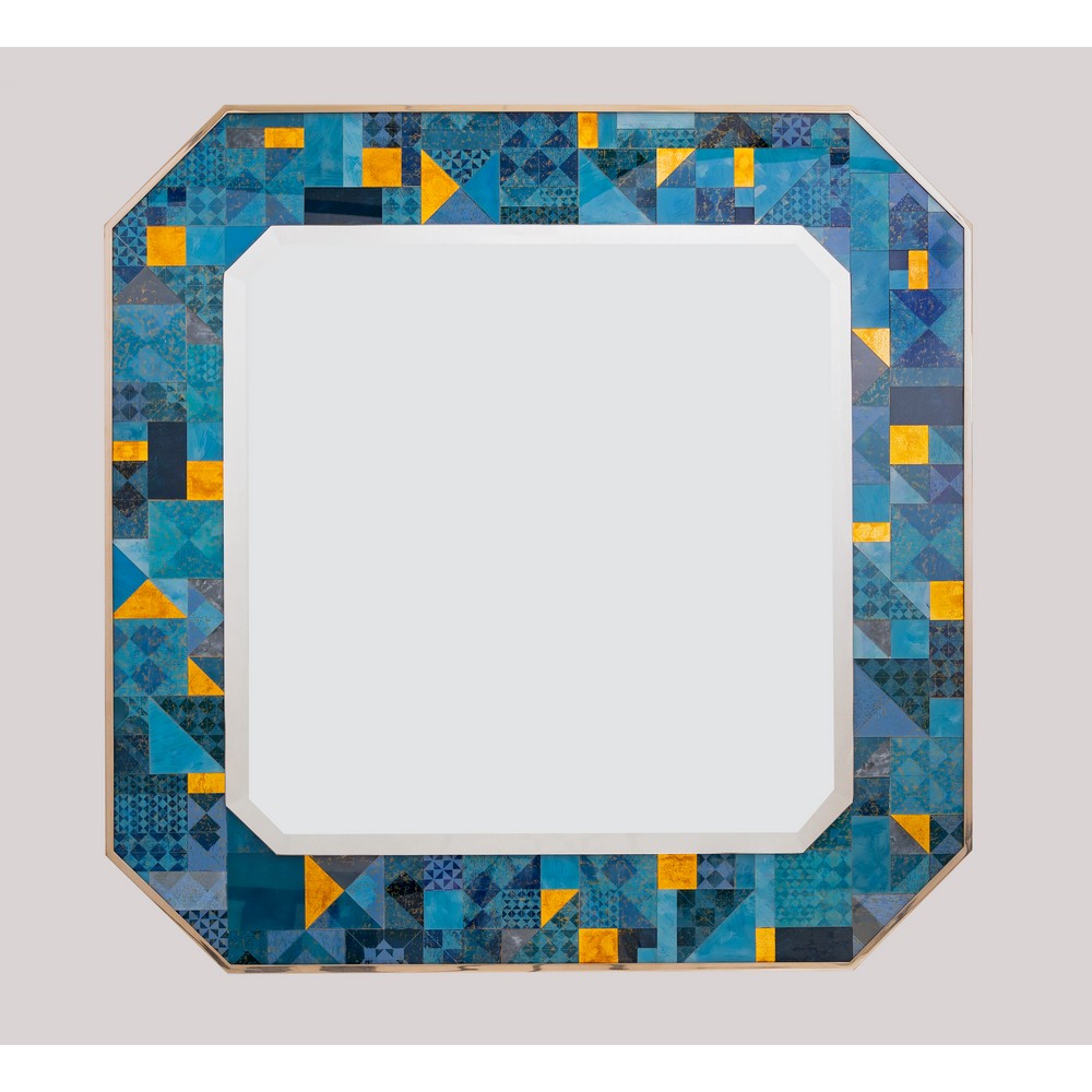 Specchio da parete ottagonale, cornice in metallo cromato e mosaico geometrico di vetri decorati nei toni del blu e oro, vetro specchiato. Etichetta di produzione e data 30-10-84.