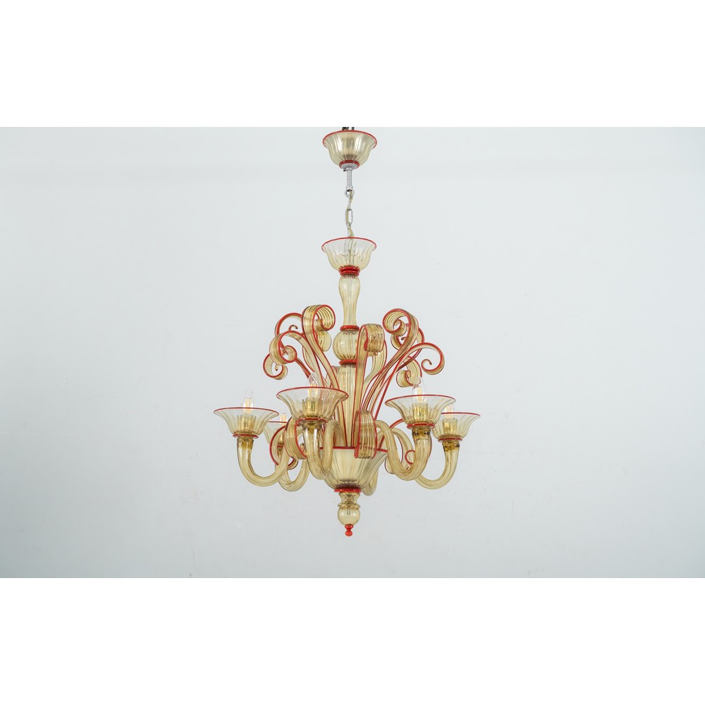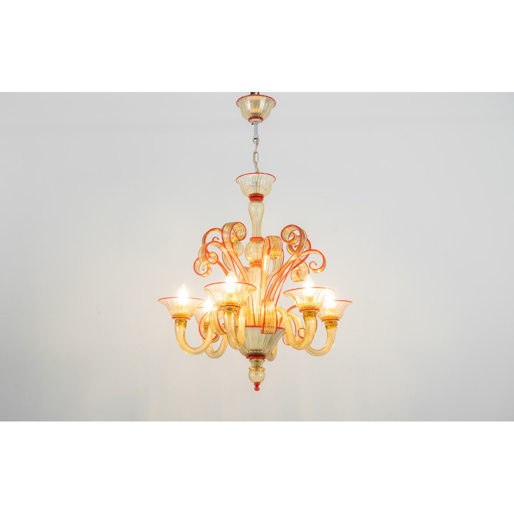 Lampada a sospensione a sei luci modello “Albrici 1932”, N. catalogo 99320106,vetro pagliesco bordato in rosso corallo, bracci ricurvi con coppe a campana.