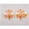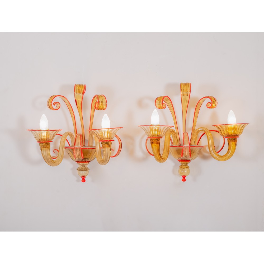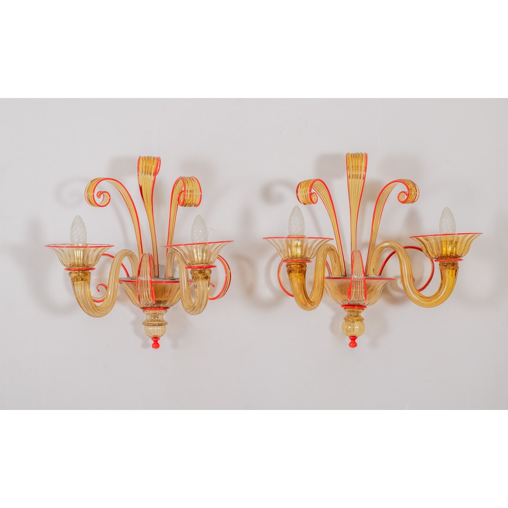 Coppia di lampade da parete a due luci modello “Albrici 1932”, N. catalogo 99320102,vetro pagliesco bordato in rosso corallo, bracci ricurvi con coppe a campana.