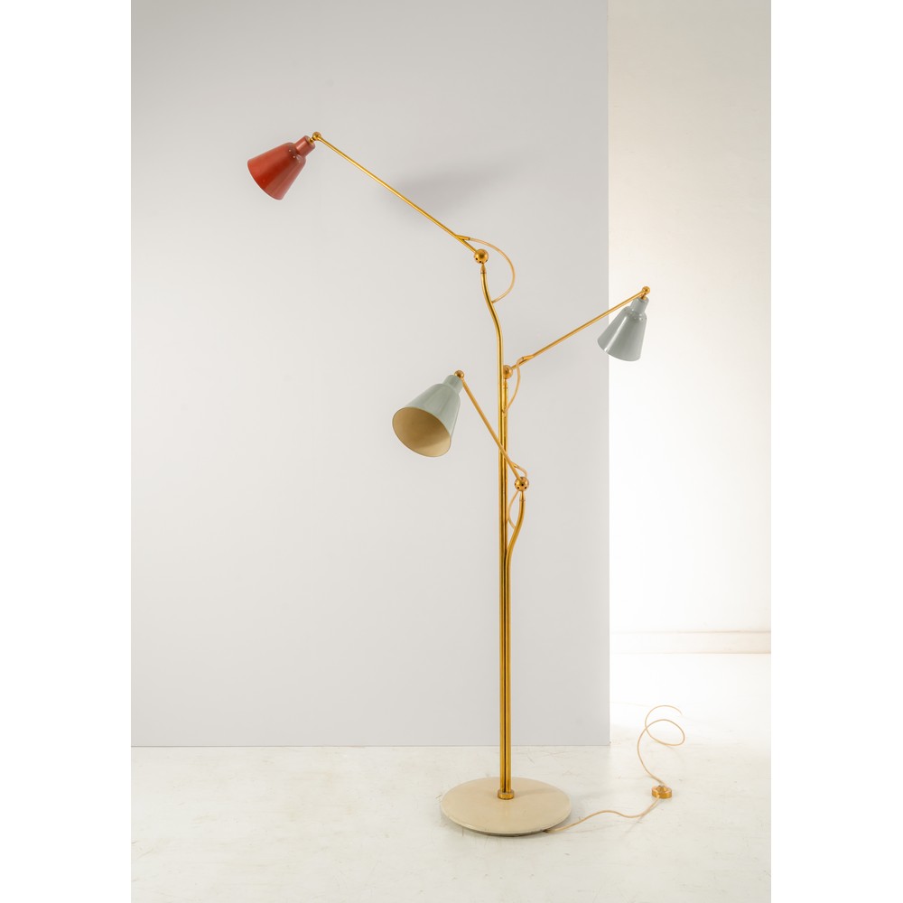 Lampada da terra a tre luci, struttura in ottone composta da tre tubolari sormontati da una sfera con fori da cui si possono fissare con diversa inclinazione i bracci in ottone, diffusori orientabili in metallo verniciato verde, rosso e grigio. Base circolare.
