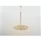 Lampada a sospensione a tre luci, struttura in ottone, diffusore circolare in metallo laccato. Elementi diffusori in vetro sabbiato.