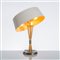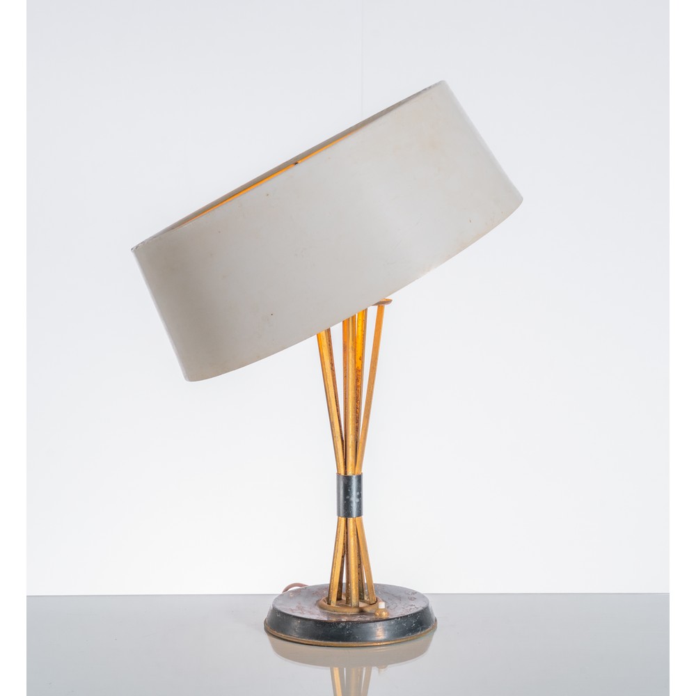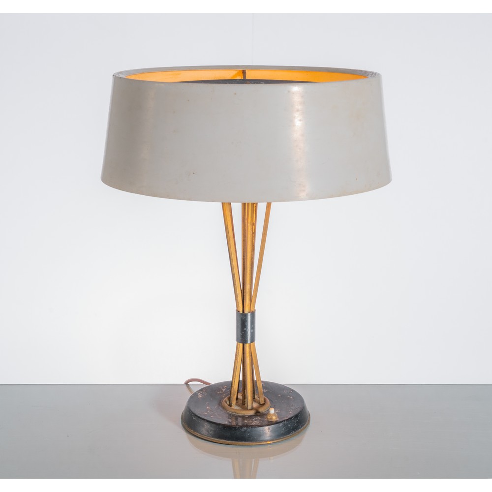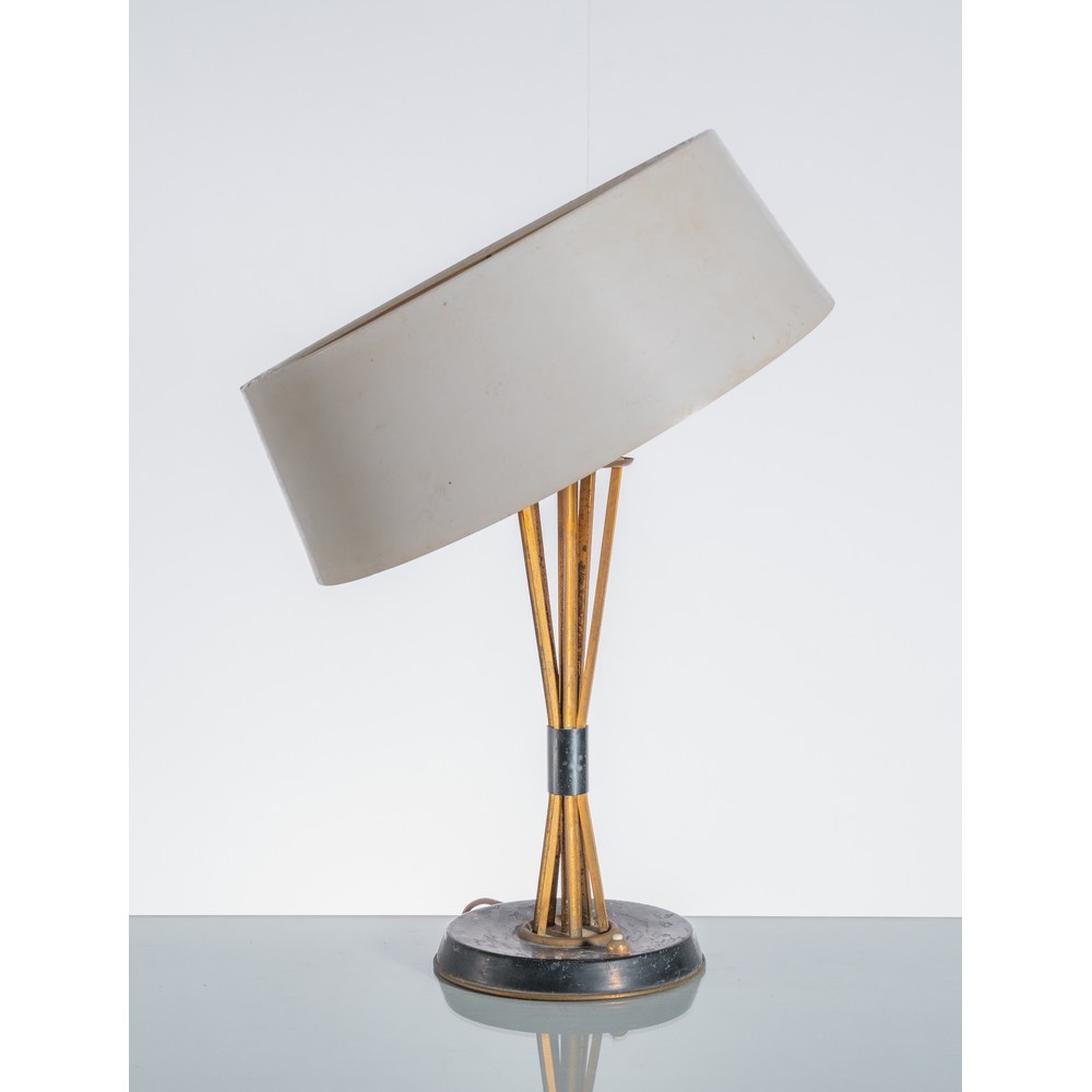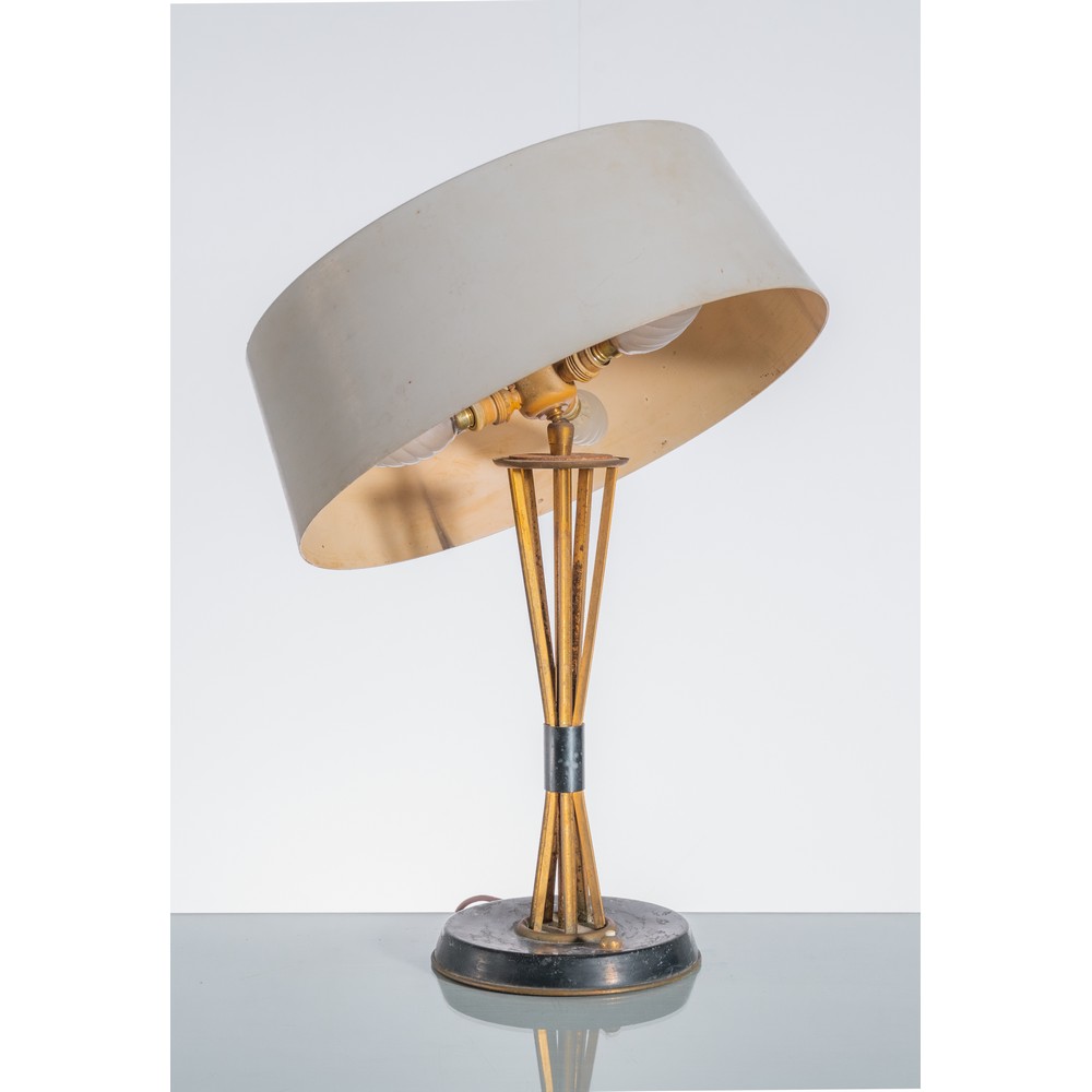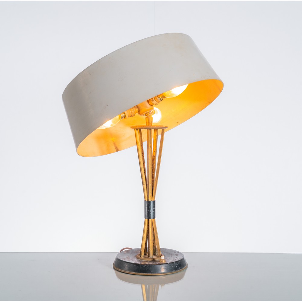 Lampada da tavolo a tre luci modello “476” struttura in ottone con diffusore orientabile in metallo laccato bianco, base circolare in metallo laccato nero.