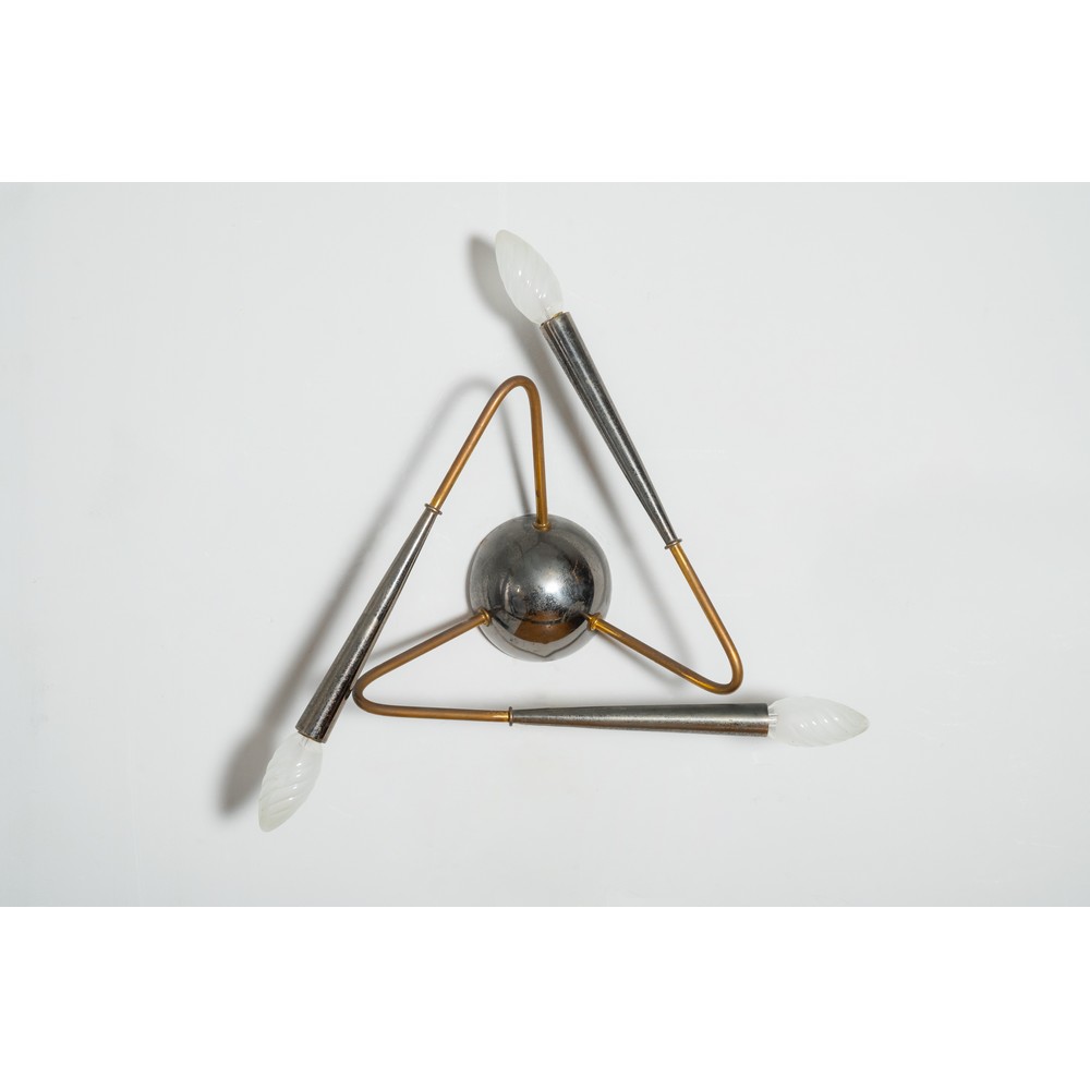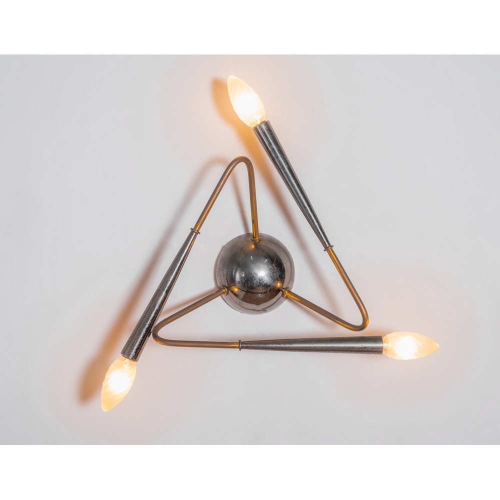 Lampada da parete a tre luci, calotta semisferica e struttura in ottone brunito, bracci in ottone.