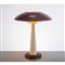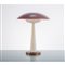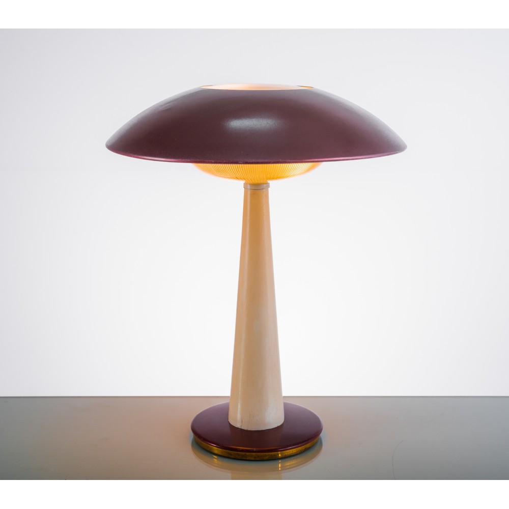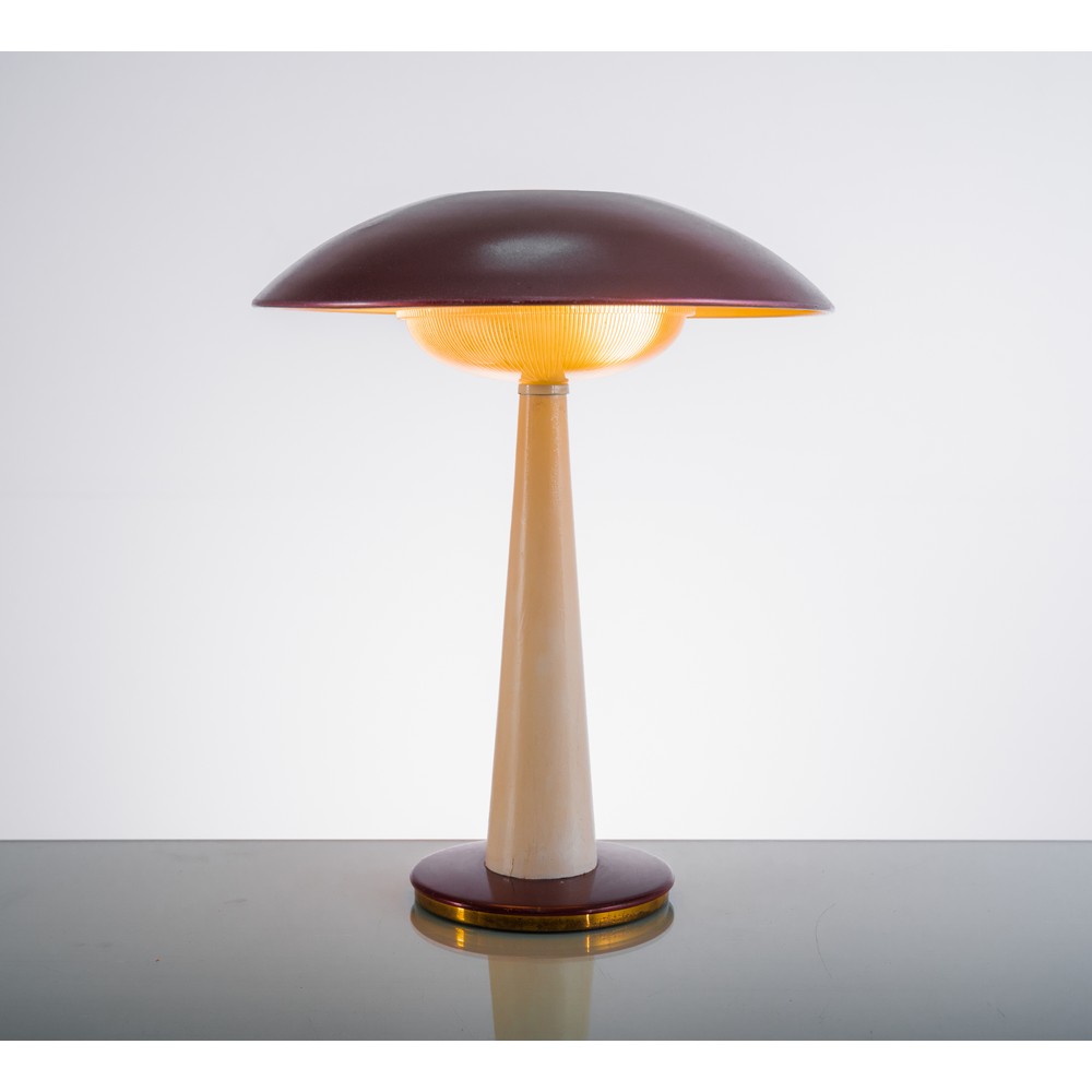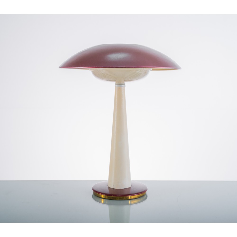 Lampada da tavolo a due luci, variante del modello “8041”,base circolare in metallo e ottone, fusto conico in metallo verniciato bianco, diffusore inferiore semisferico in vetro a stampo incolore, diffusore superiore in metallo verniciato rosso e vetro opale. Marchio incusso sotto la base.