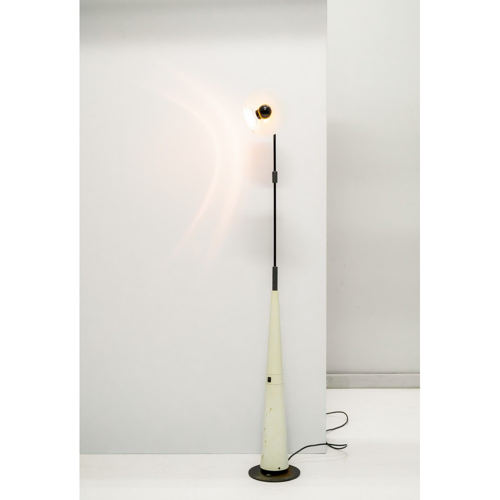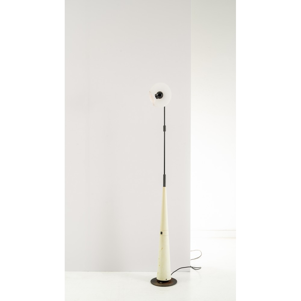 Lampada da terra ad una luce modello “Club 1195”, base conica in metallo verniciato bianco, stelo estendibile, diffusore orientabile in plex, base circolare in metallo circolare nero.