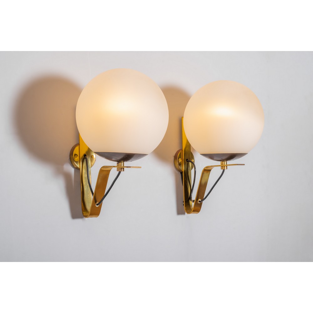 Coppia di lampade da parete ad una luce modello "B464", struttura in ottone, diffusore sferico in vetro satinato.