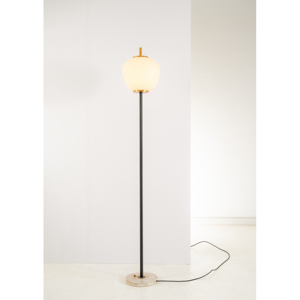 Lampada da terra ad una luce, stelo in metallo verniciato, diffusore ovalizzato in vetro opalino, ottone, base circolare in marmo.