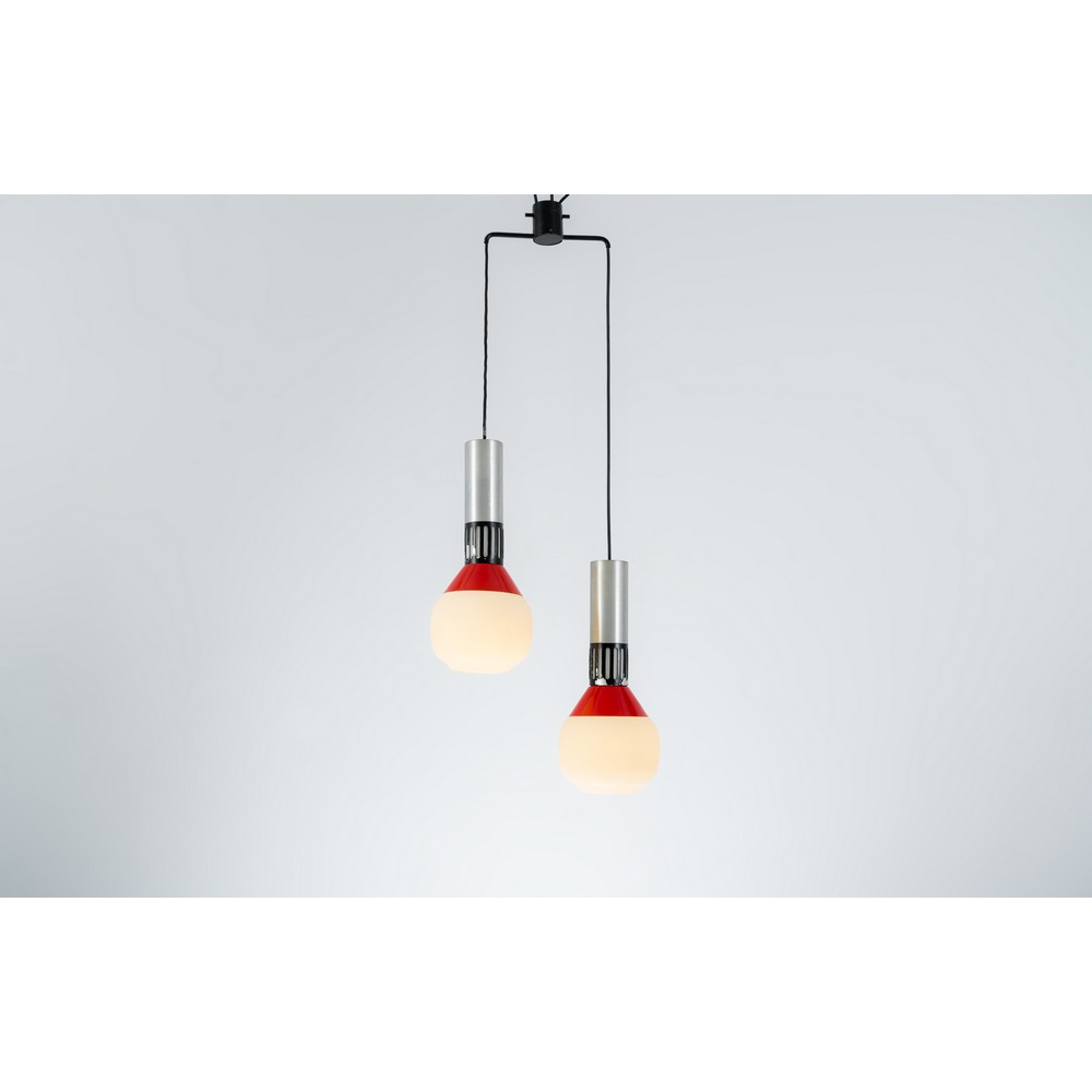 Lampada a sospensione modello "1247", a due elementi cilindrici in alluminio e metallo laccato nero e rosso, paralumi in vetro bianco “Triplex Opal” satinato.