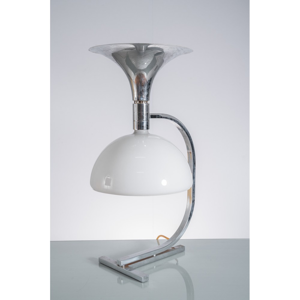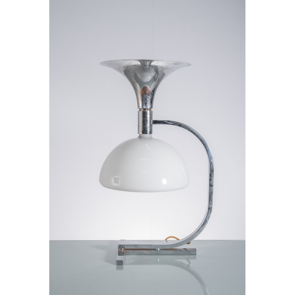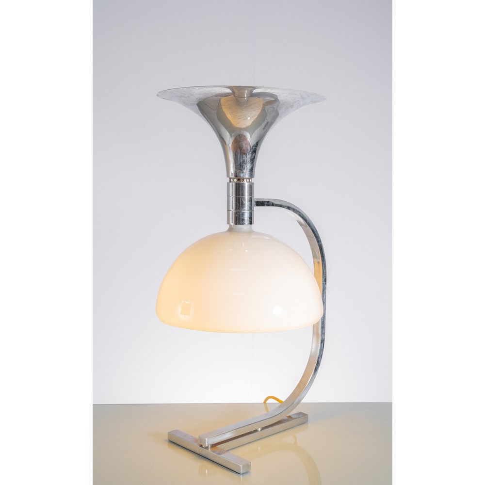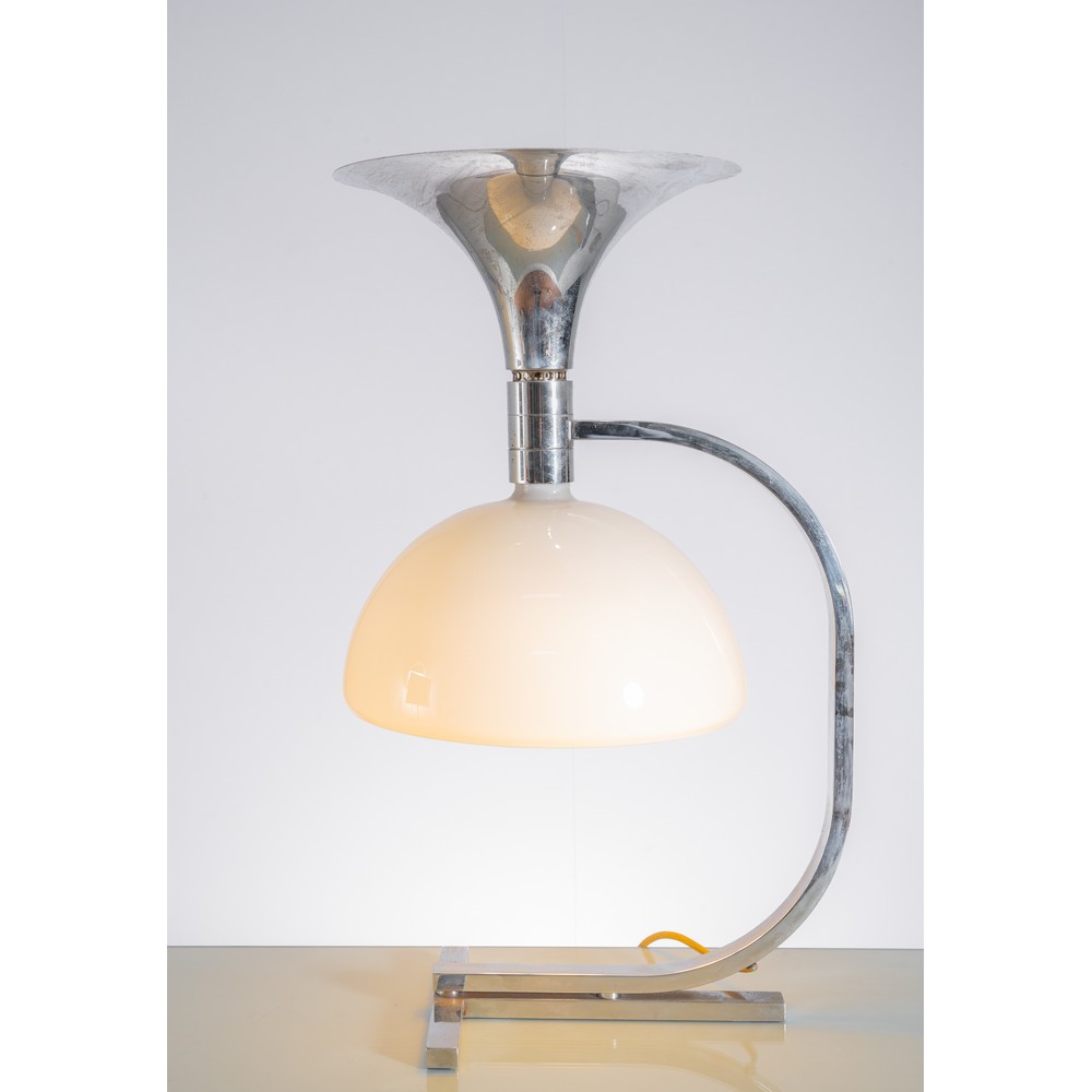 Lampada da tavolo a quattro luci modello "AM/AS", struttura in acciaio cromato, diffusore in vetro opalino.