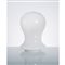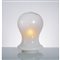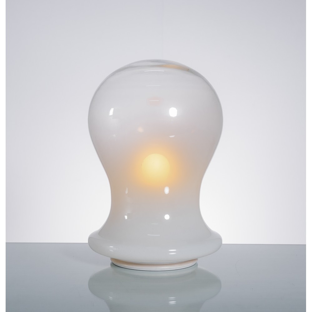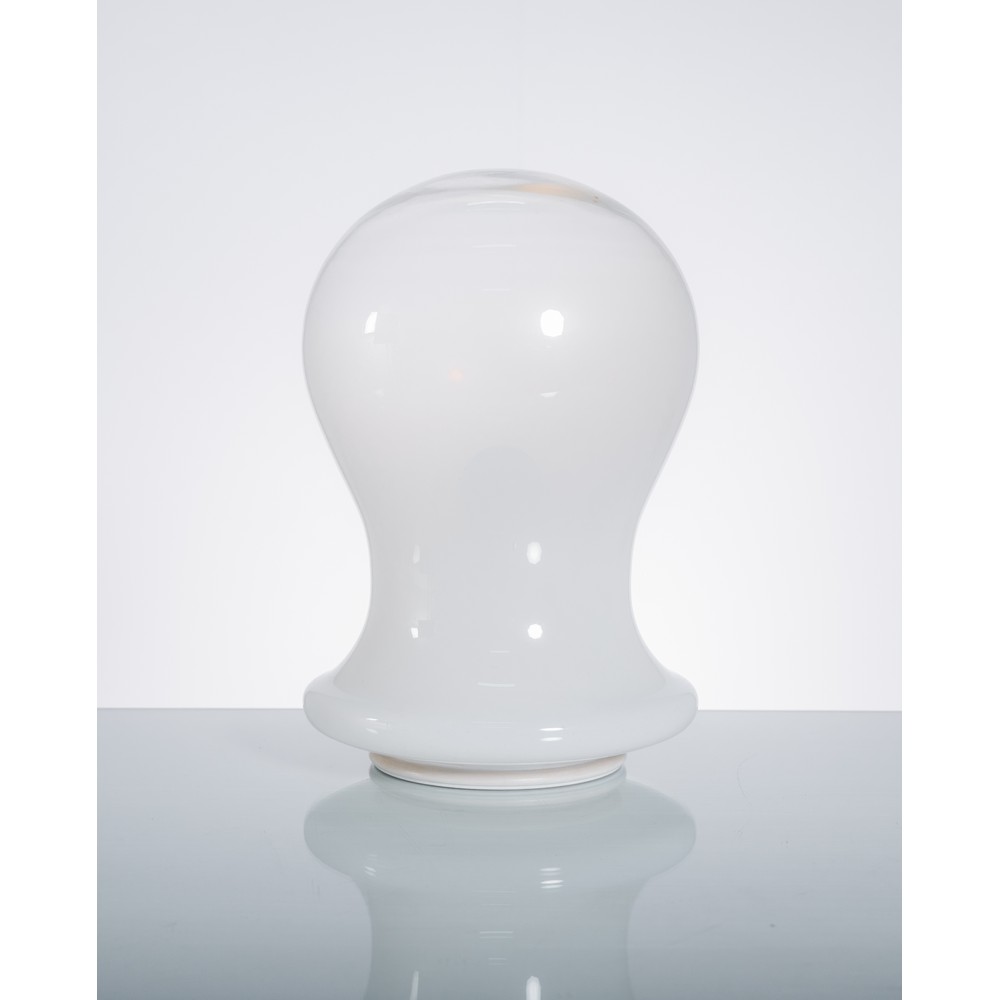 Lampada da tavolo ad una luce, diffusore a birillo in vetro lattimo, base circolare in metallo verniciato bianco.