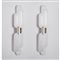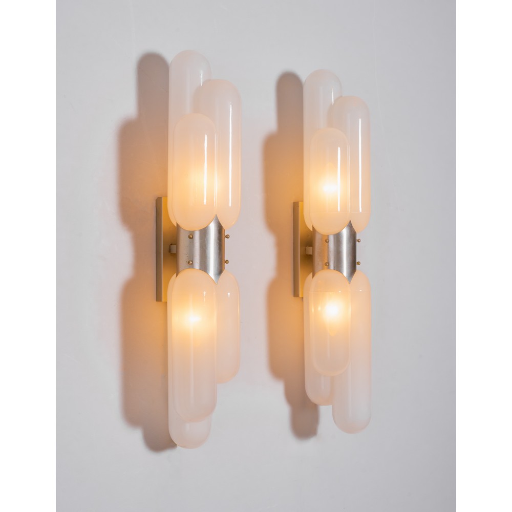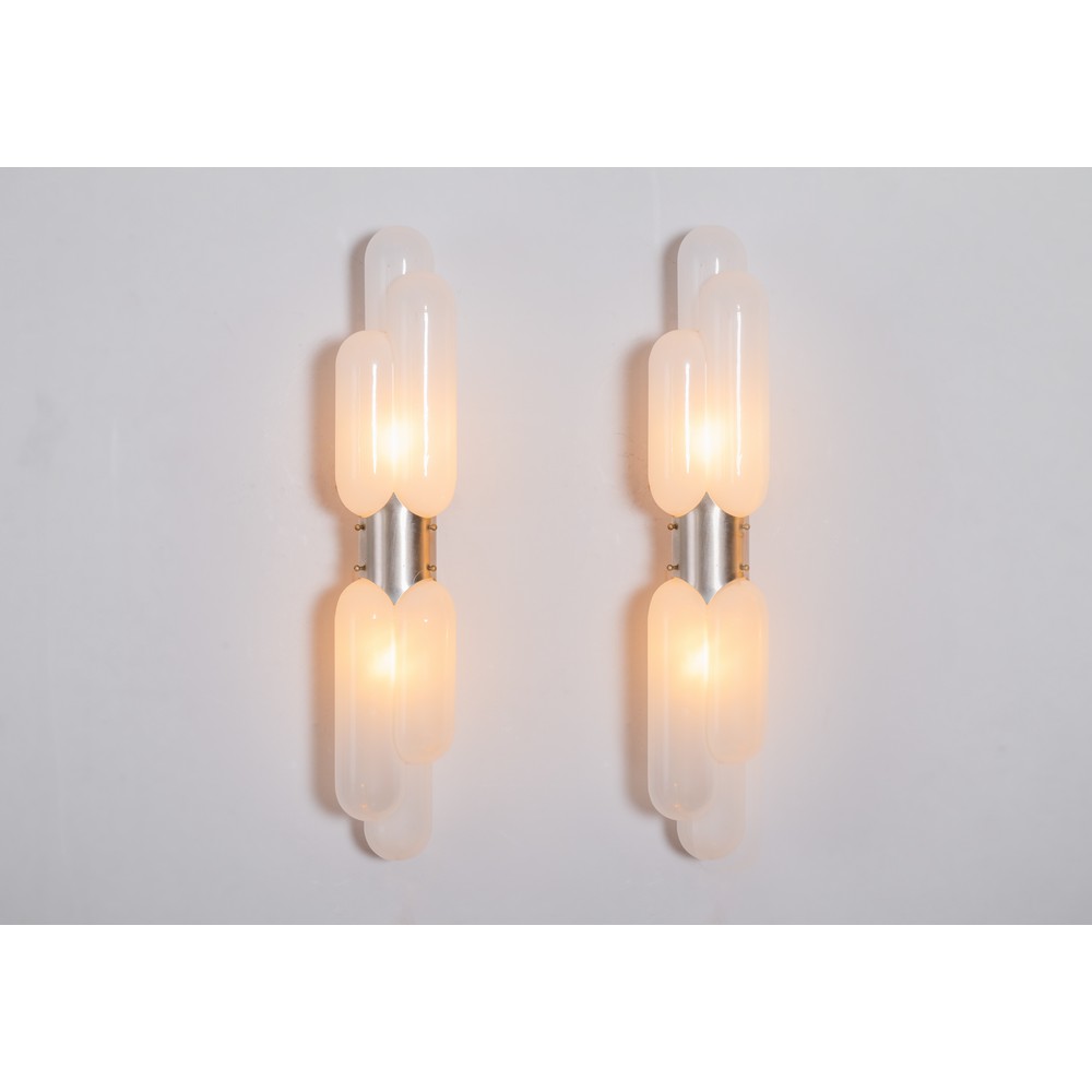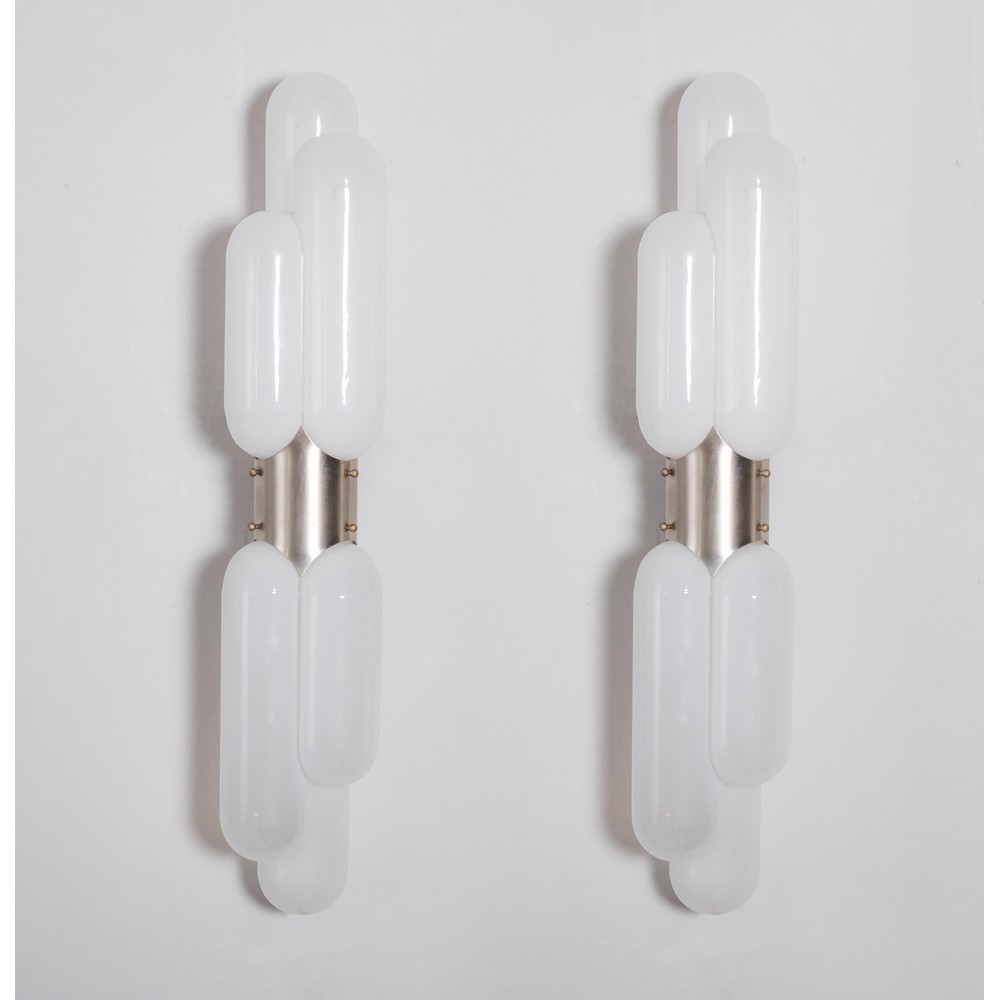 Coppia di lampade da parete a due luci modello “Torpedo”, struttuta in metallo cromato con diffusori cilindrici in vetro opalino.