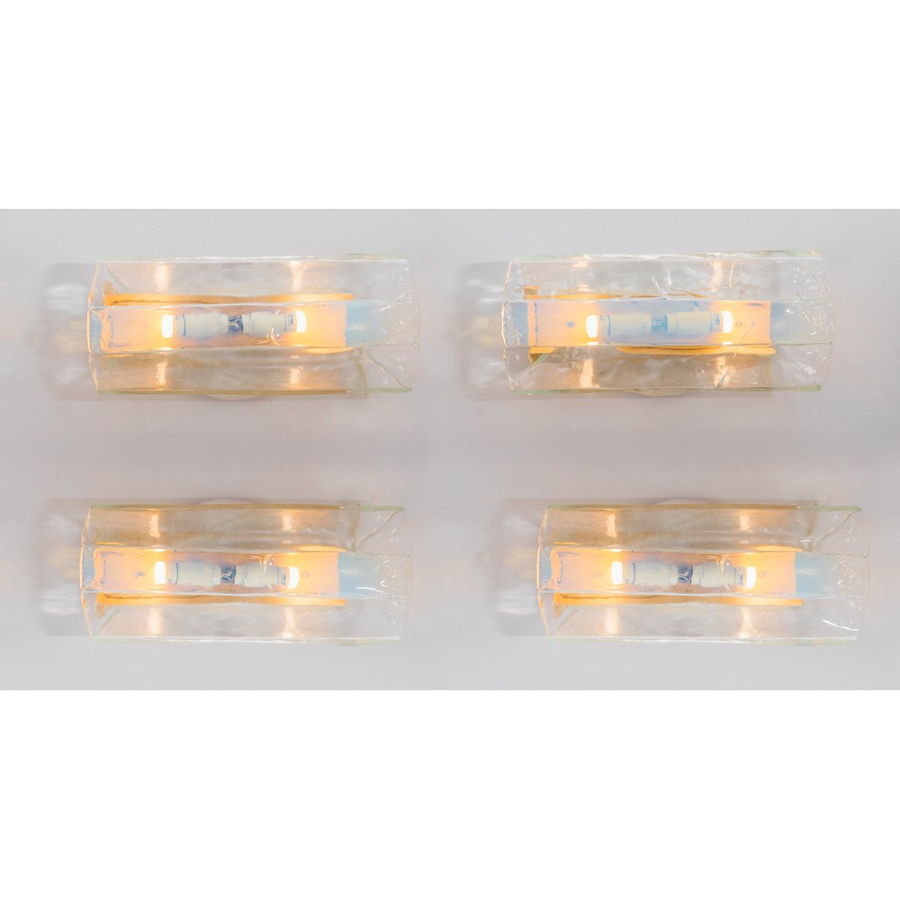 Quattro lampade da parete, struttura in metallo verniciato, corpo rettangolare in vetro curvato nei toni trasparente ed opale.