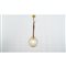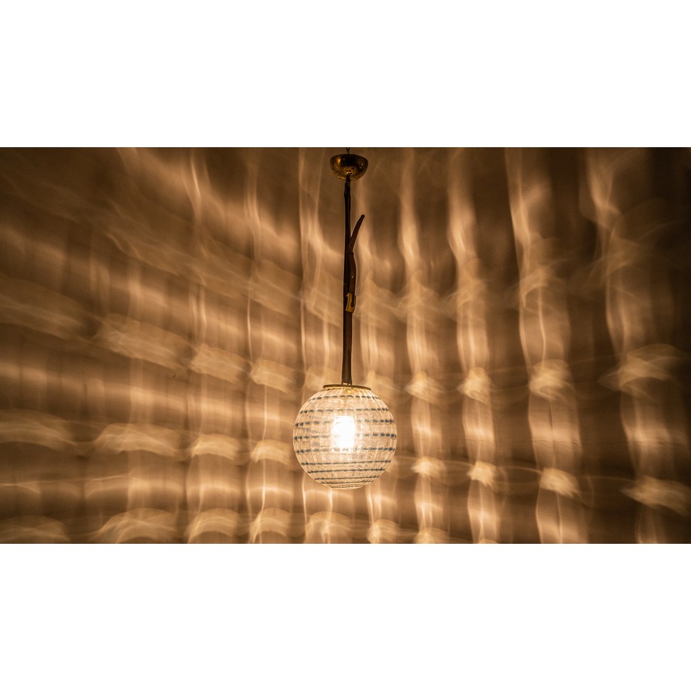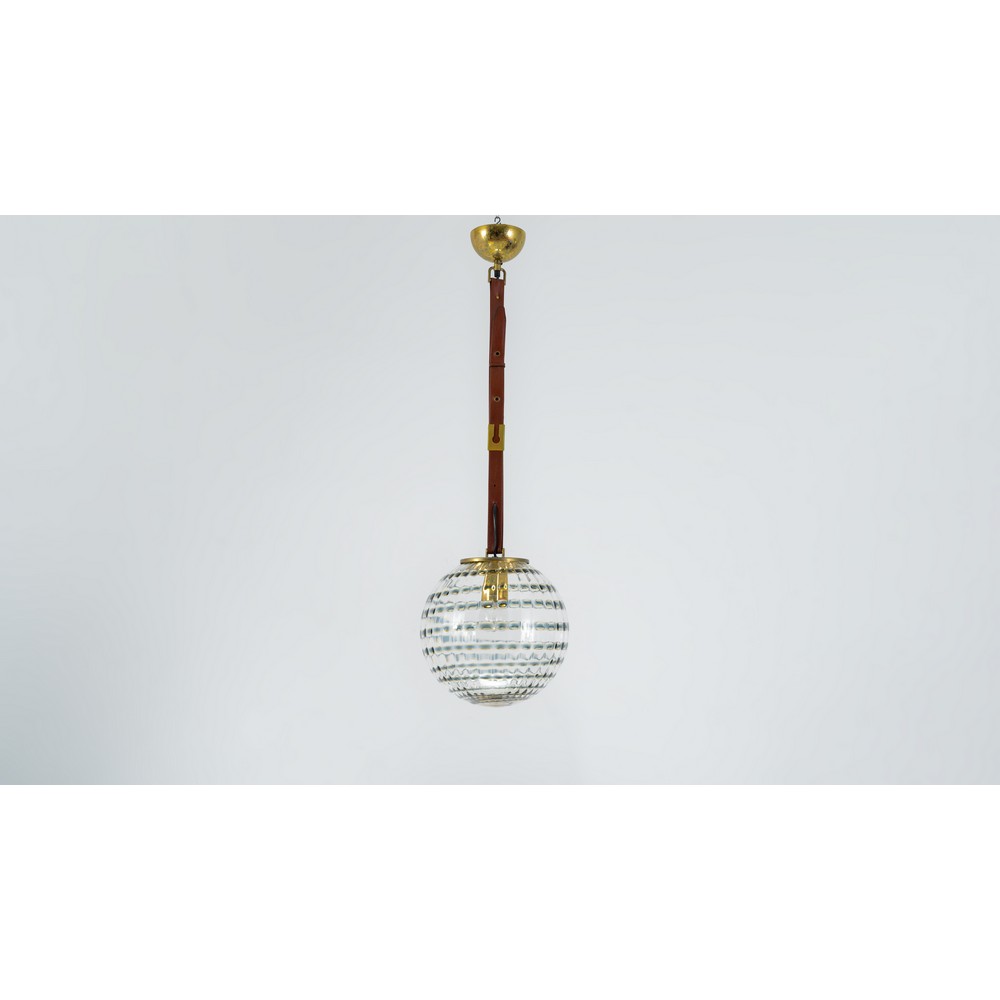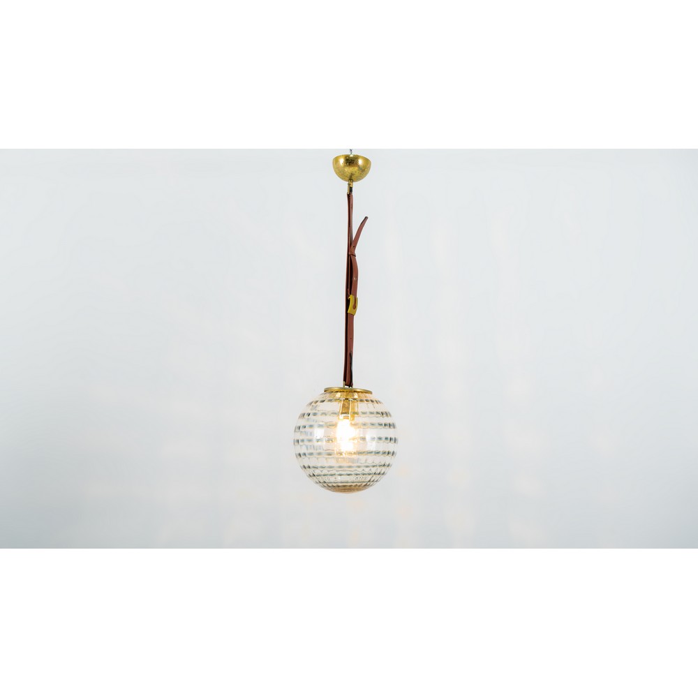 Lampada a sospensione ad una luce, diffusore sferico in vetro cordonato incolore e decorato con anelli scuri e paglierini. Struttura in metallo dorato con cinghia in pelle marrone.