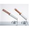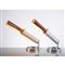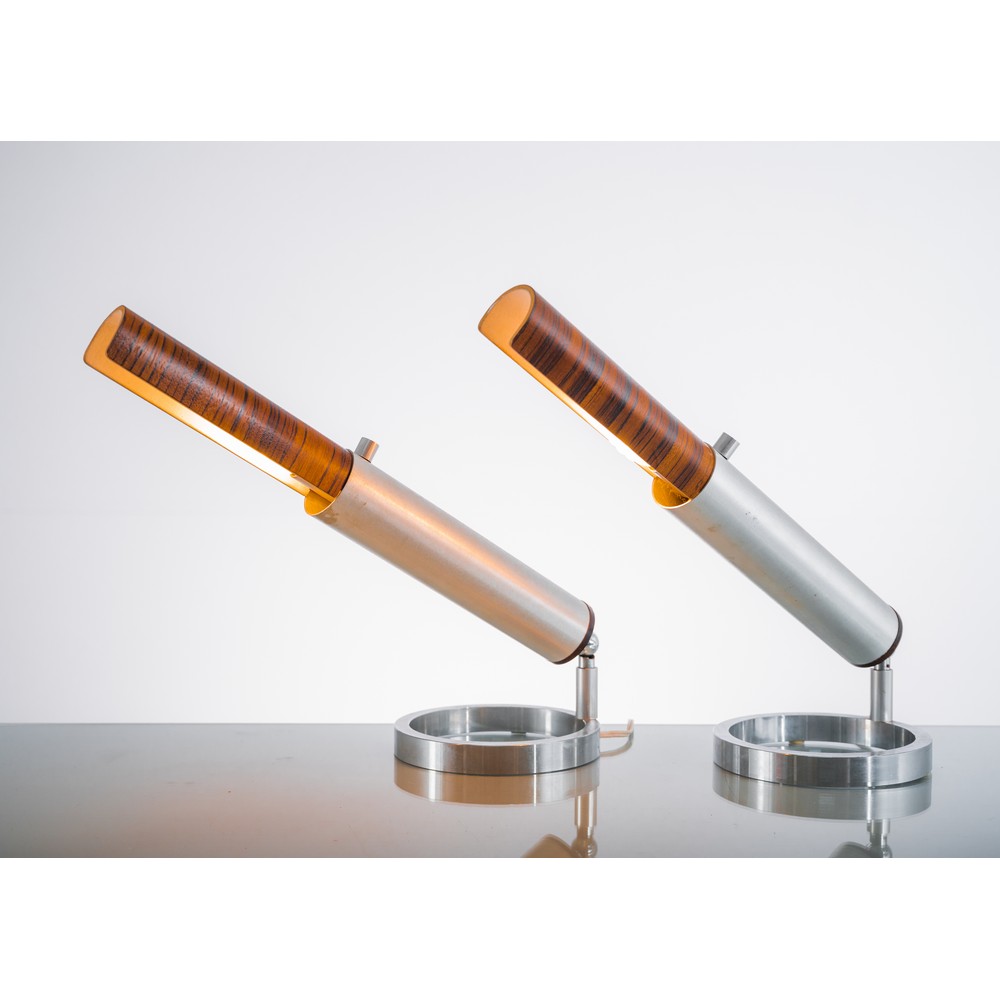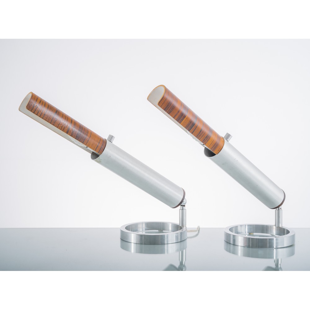 Coppia di lampade da tavolo ad un luce, base circolare in acciaio cromato, stelo conico orientabile in alluminio, diffusore semicilindrico in alluminio verniciato a effetto legno.