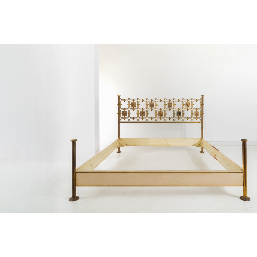 Letto matrimoniale con struttura in ottone e metallo laccato bianco. Testiera in ottone con piastre scultoree in fusione di bronzo ad opera di Arnaldo Pomodoro.