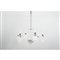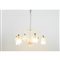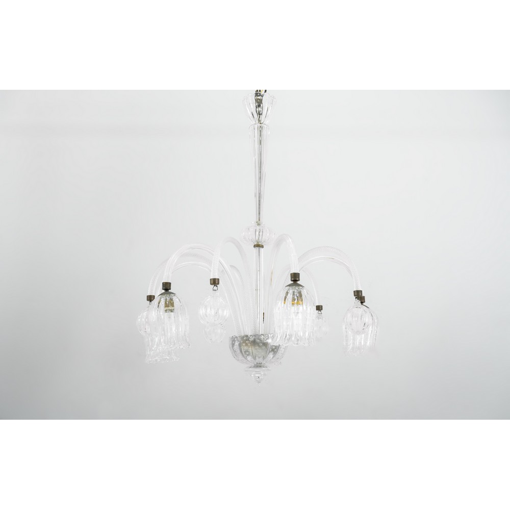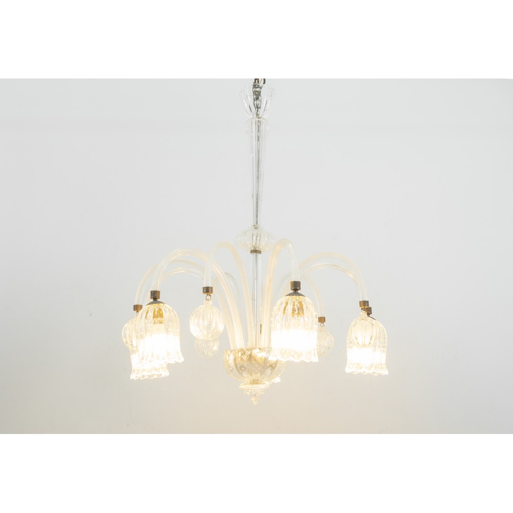 Lampada a sospensione a cinque luci in vetro incolore costoluto e bullicante, dieci bracci curvati in basso, cinque con diffusori a campana e cinque sfere, ottone.