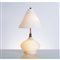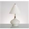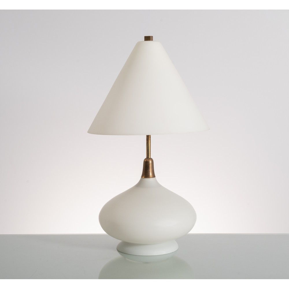 Lampada da tavolo ad una luce in vetro bianco, corpo a goccia con diffusore conico, elementi di giunzione in ottone lucido.